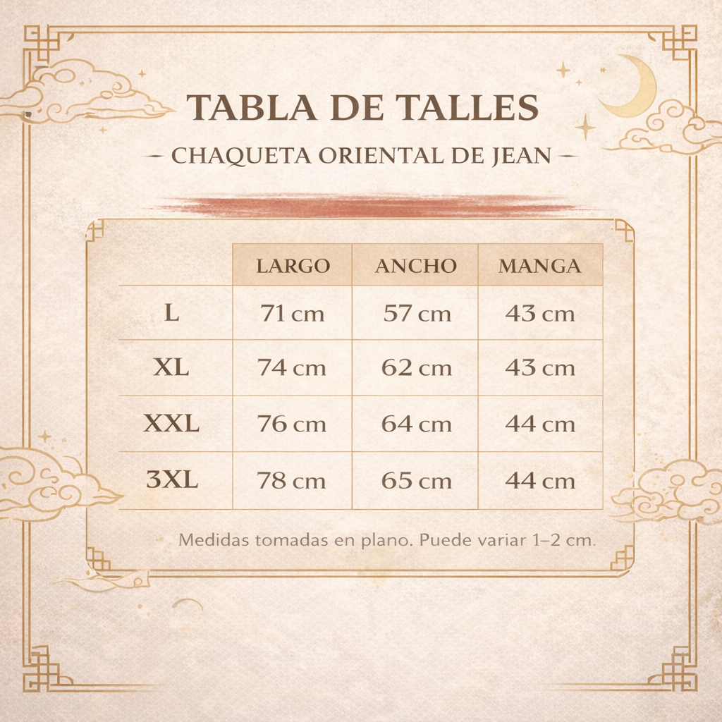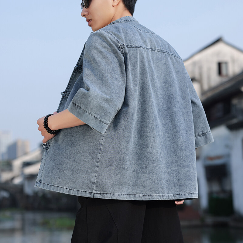 Chaqueta de jean con inspiración oriental, con cuello mao y cierres tipo alamar (nudos chinos) al frente. Calce relajado y cómodo, ideal para un look streetwear con estética asiática.