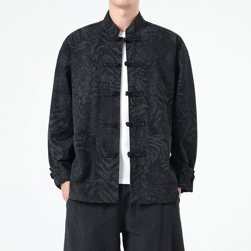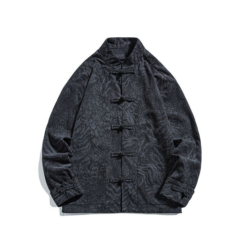 Chaqueta estilo oriental de corte recto con cuello mao y cierre tradicional tipo nudo chino. Confeccionada en tela negra texturada tipo corderoy con patrón sutil inspirado en dragones, aporta un look elegante y sobrio sin ser llamativo. Ideal para outfits urbanos, minimalistas u ocasiones especiales. Calce cómodo, versátil y fácil de combinar.
