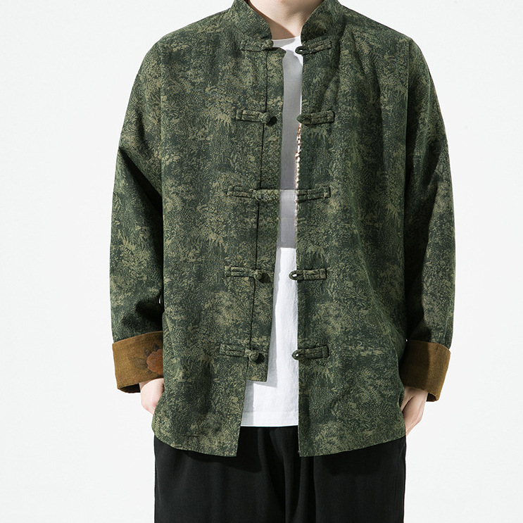 Chaqueta oriental de corte clásico confeccionada en tela verde con textura sutil. Diseño cómodo con cuello mao y cierres tradicionales. Una prenda versátil que combina lo tradicional con un look urbano moderno.