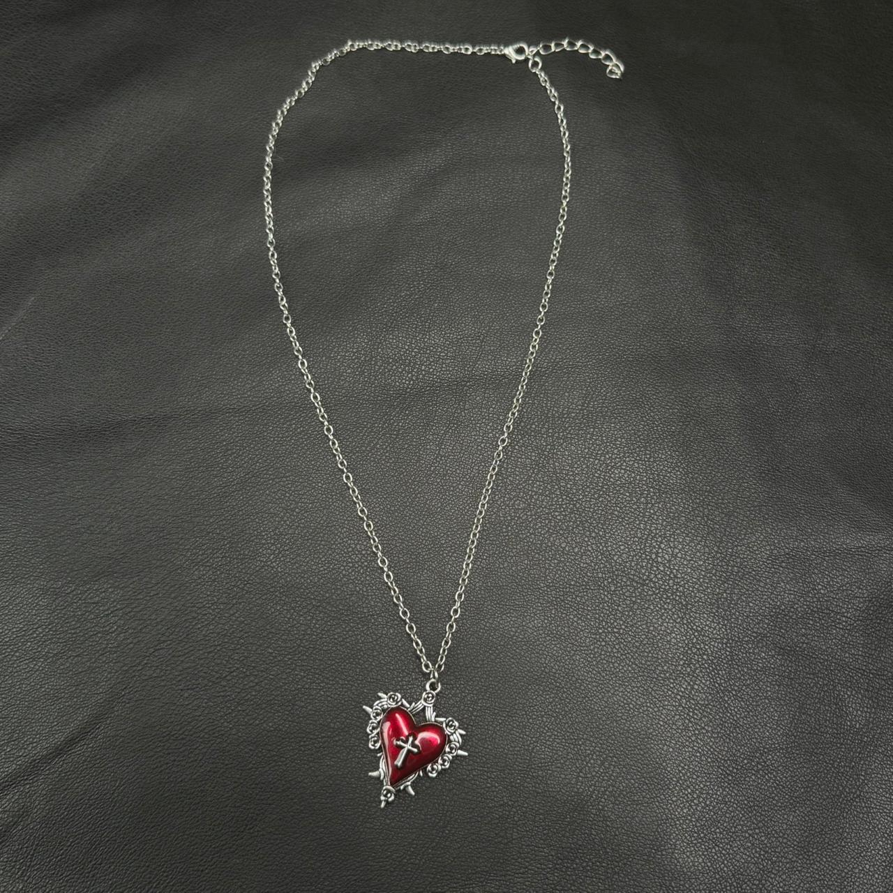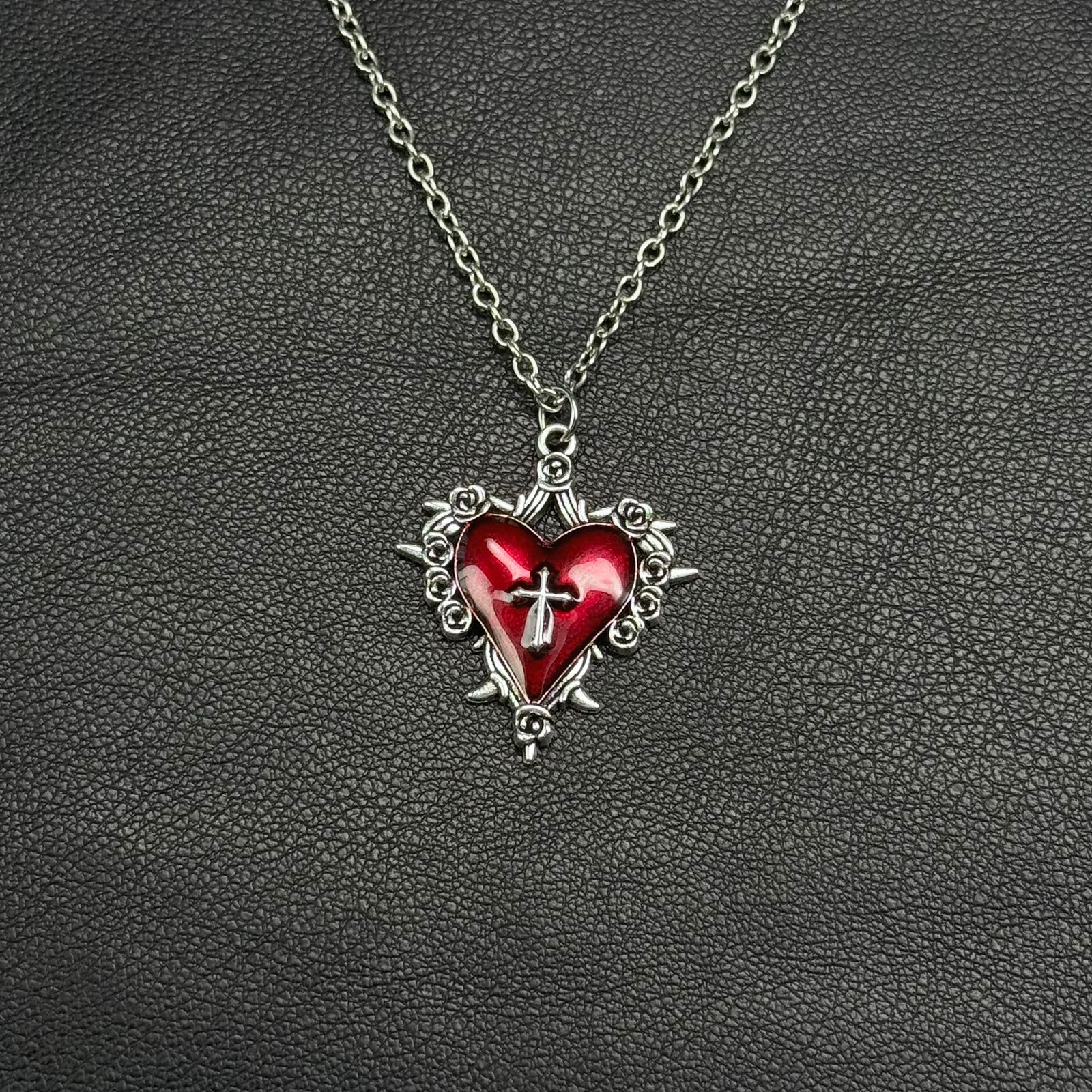 Collar con dije de corazón rojo rodeado de espinas y una cruz central.