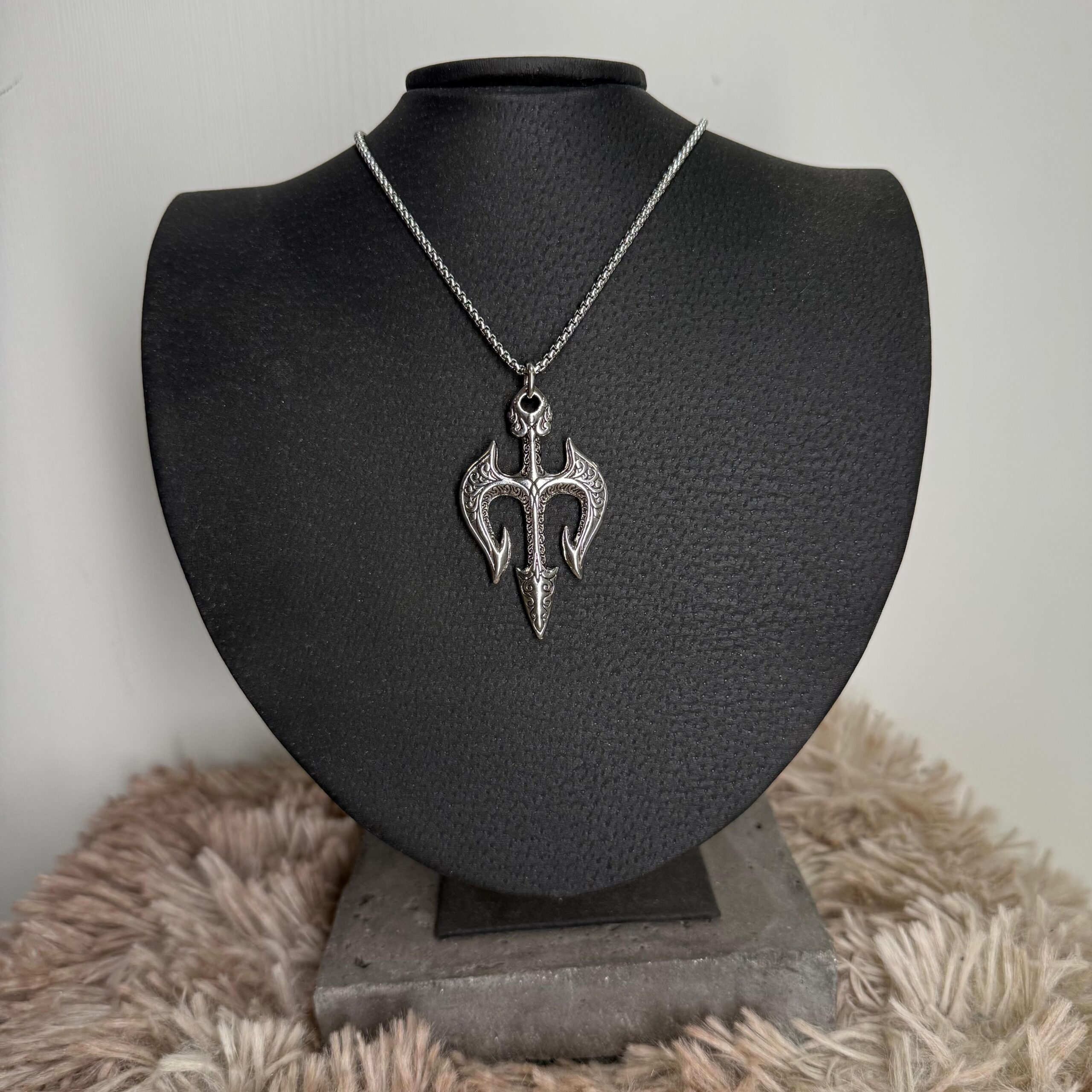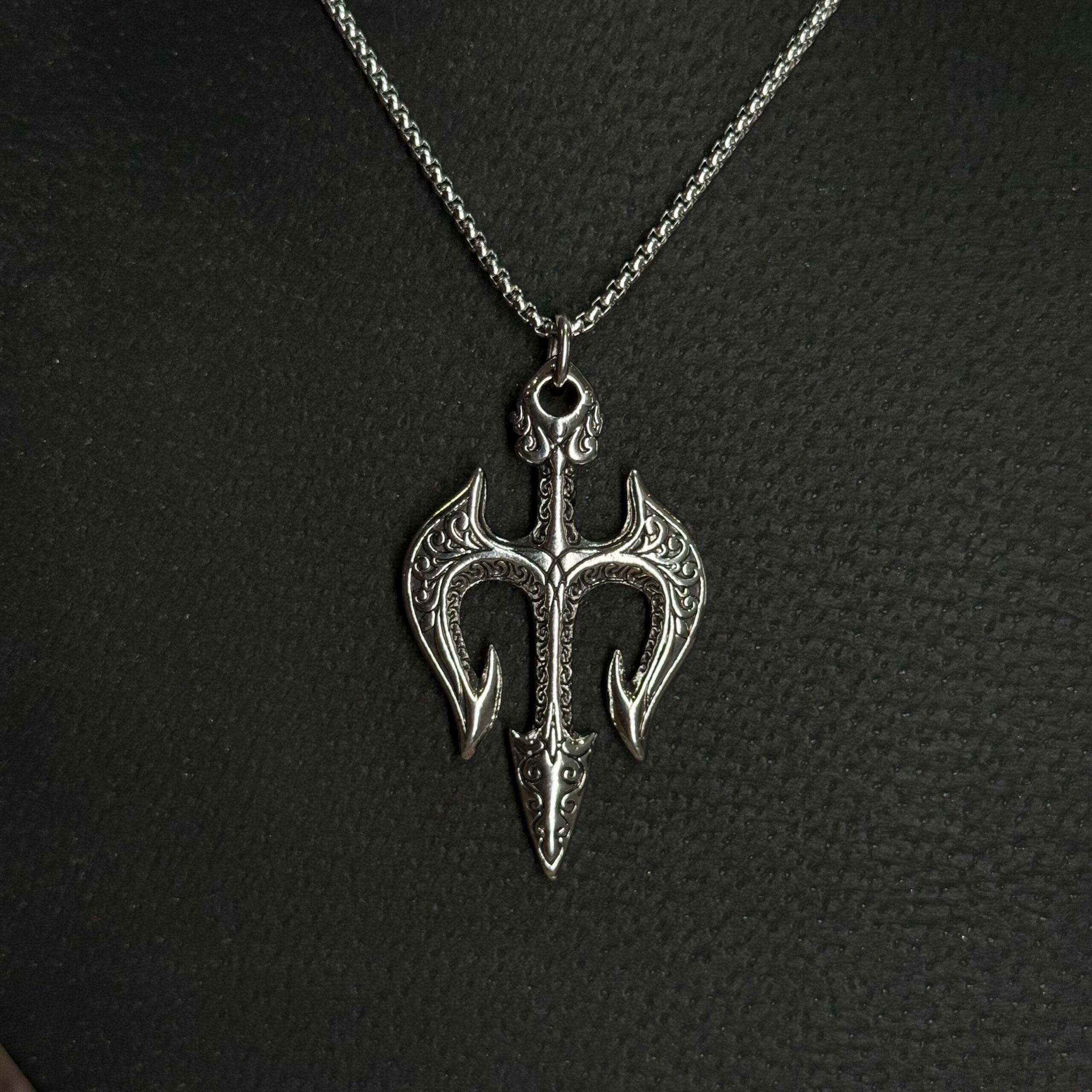 Collar con dije tipo hacha doble de estética vikinga/medieval, con grabados en relieve que le dan un look bien guerrero y alternativo. Terminación metálica color plata, ideal para outfits urbanos, rock o góticos. Cadena resistente con cierre seguro.