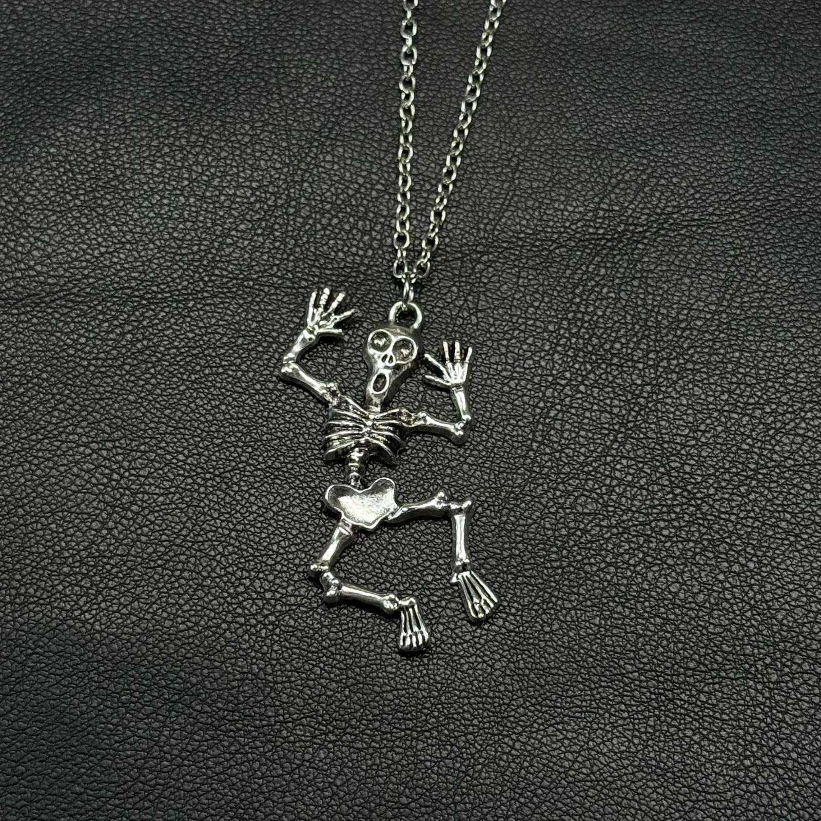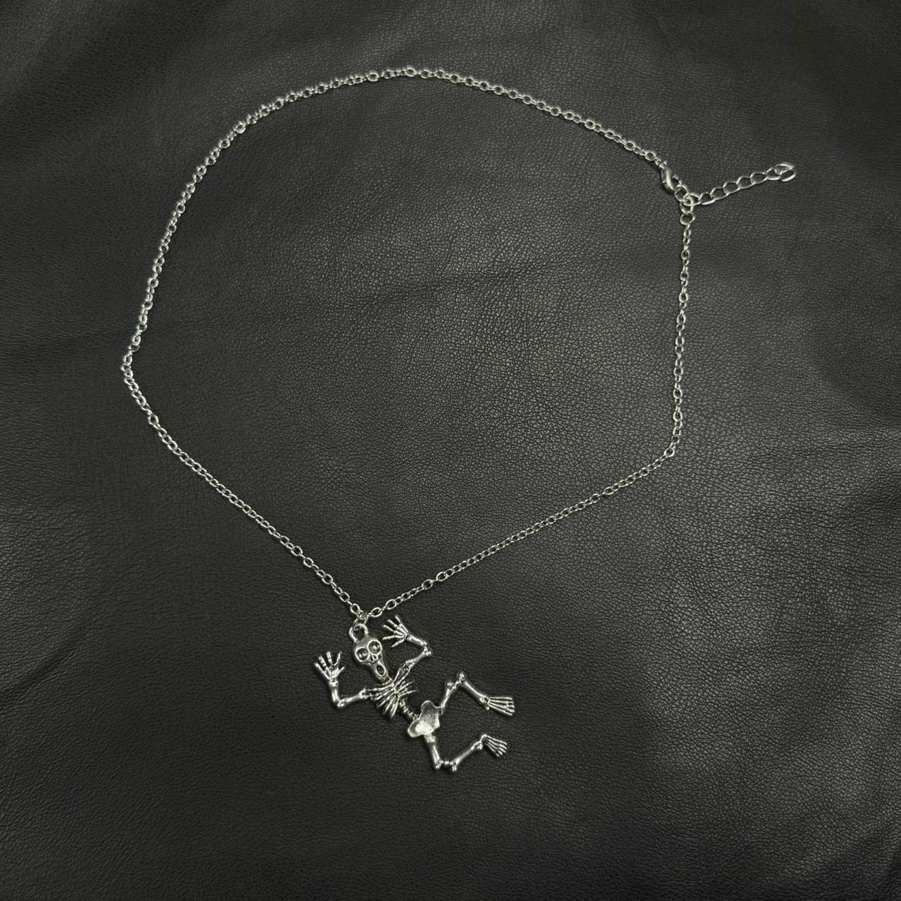 Collar con colgante de esqueleto articulado en metal plateado.