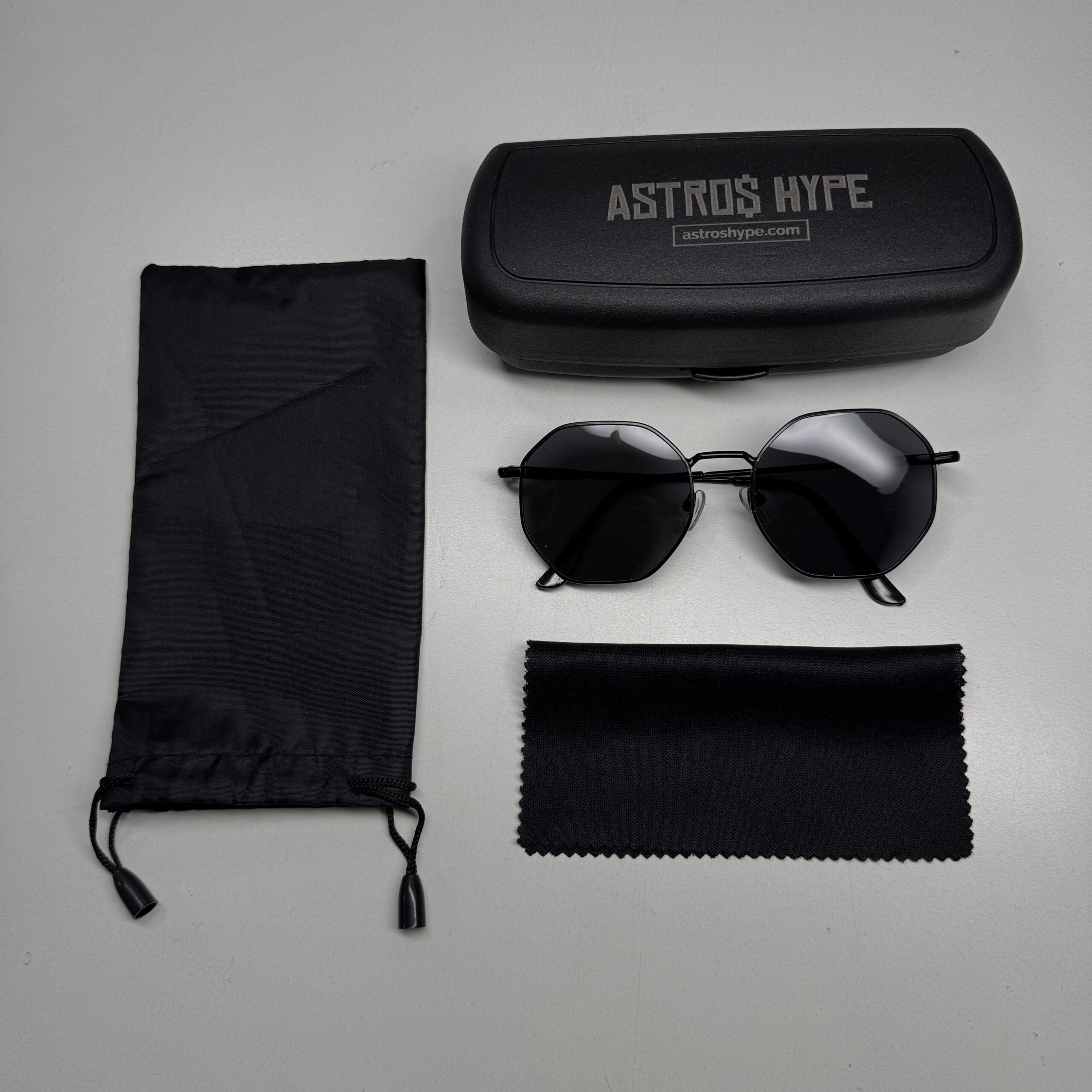 Modelo metálico totalmente negro, tanto marco como lentes. Estética minimal y dark, una opción unisex de alto impacto. Incluye estuche ASTRO$ HYPE, funda y paño.