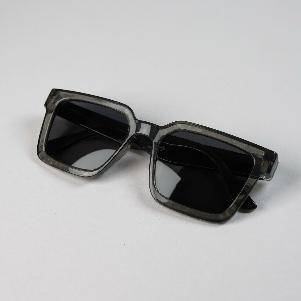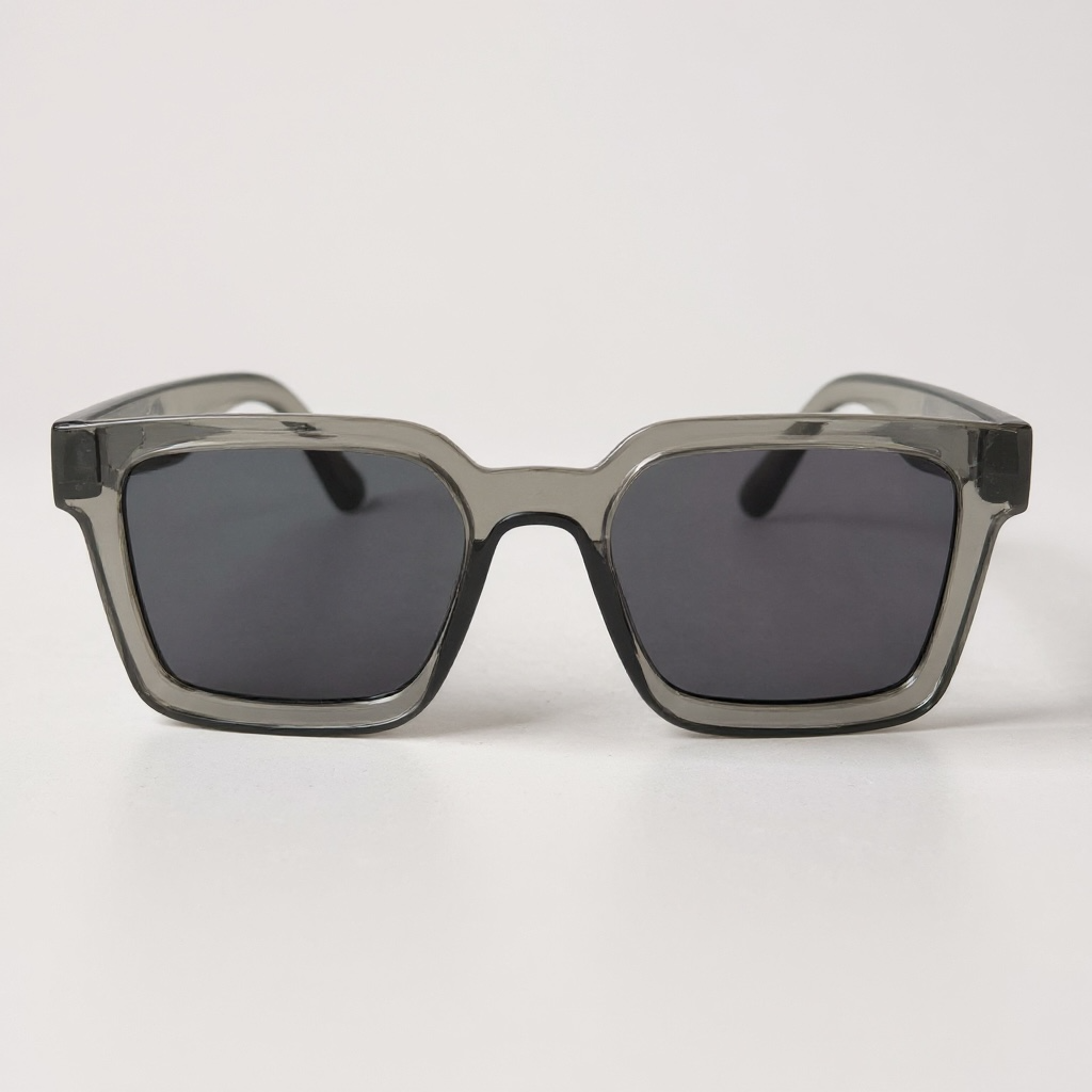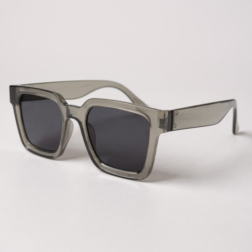 Gafas con marco grueso de policarbonato gris translúcido y diseño cuadrado. Lentes oscuras, cómodas y resistentes. Estilo callejero con presencia.