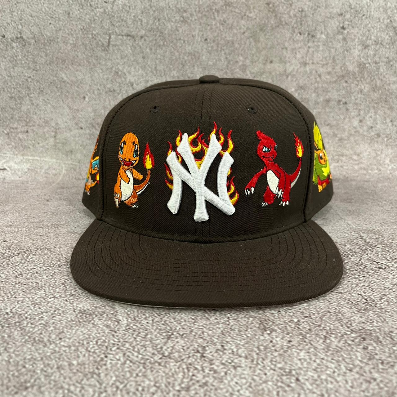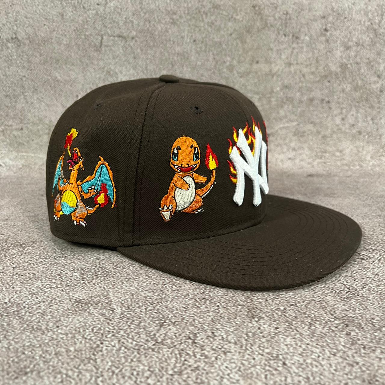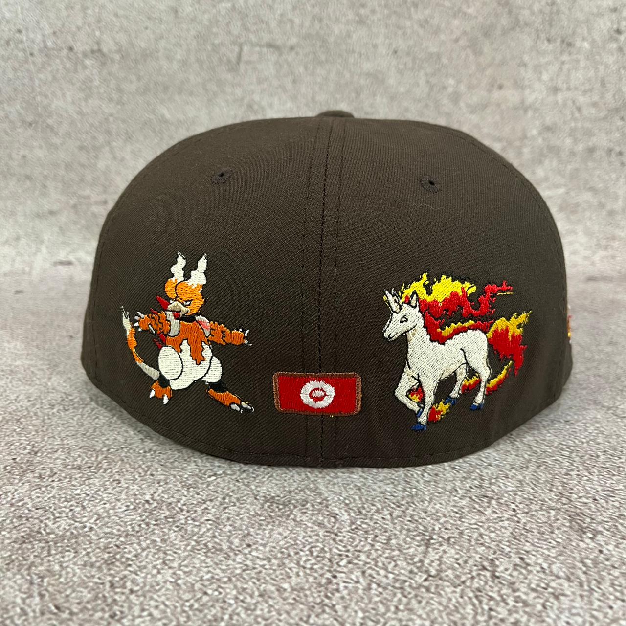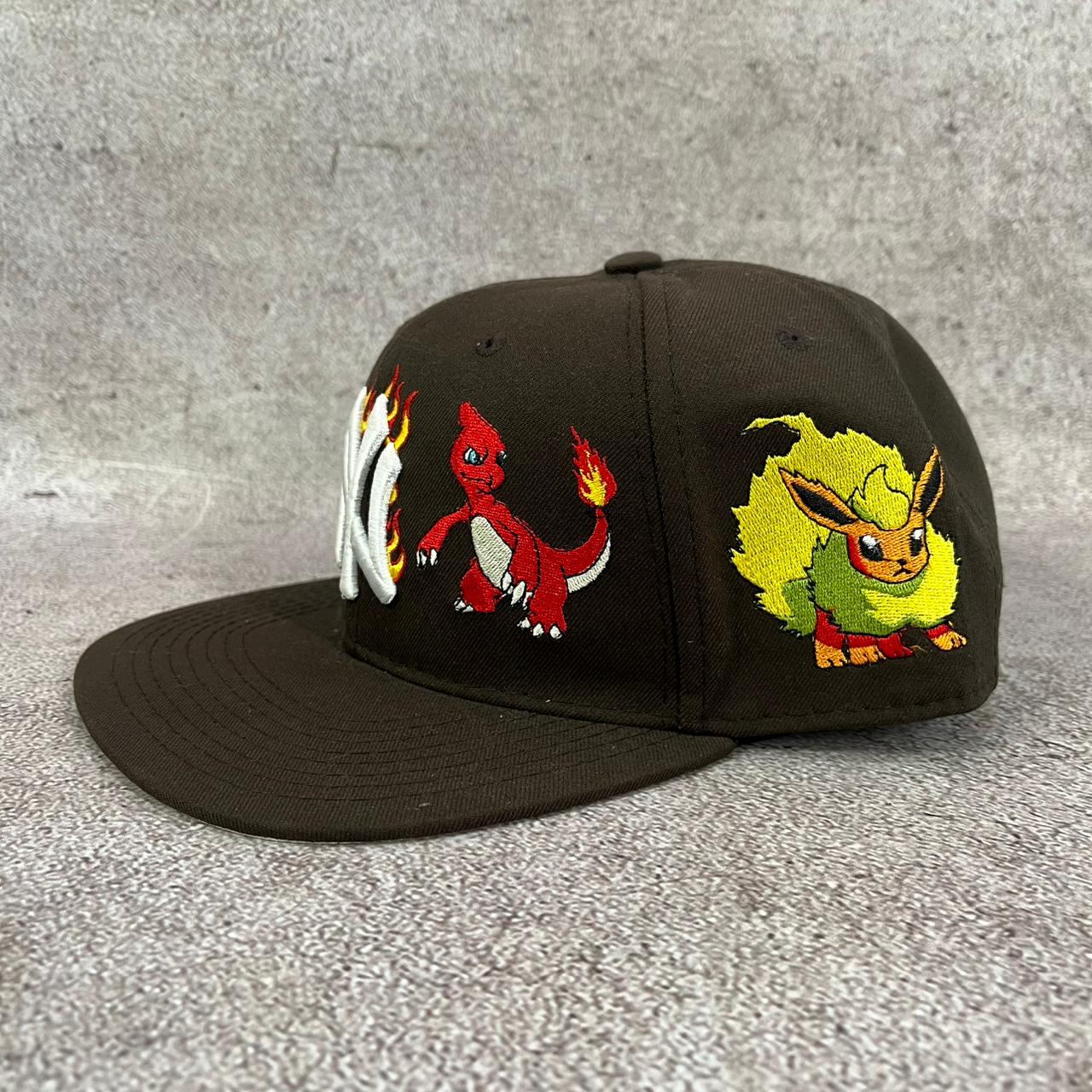 Gorra New Era tipo fitted (cerrada) en color marrón , con bordados premium de personajes estilo Pokémon de tipo fuego alrededor de toda la gorra (frente, laterales y parte trasera). Un modelo bien llamativo, ideal para outfit urbano y coleccionistas.