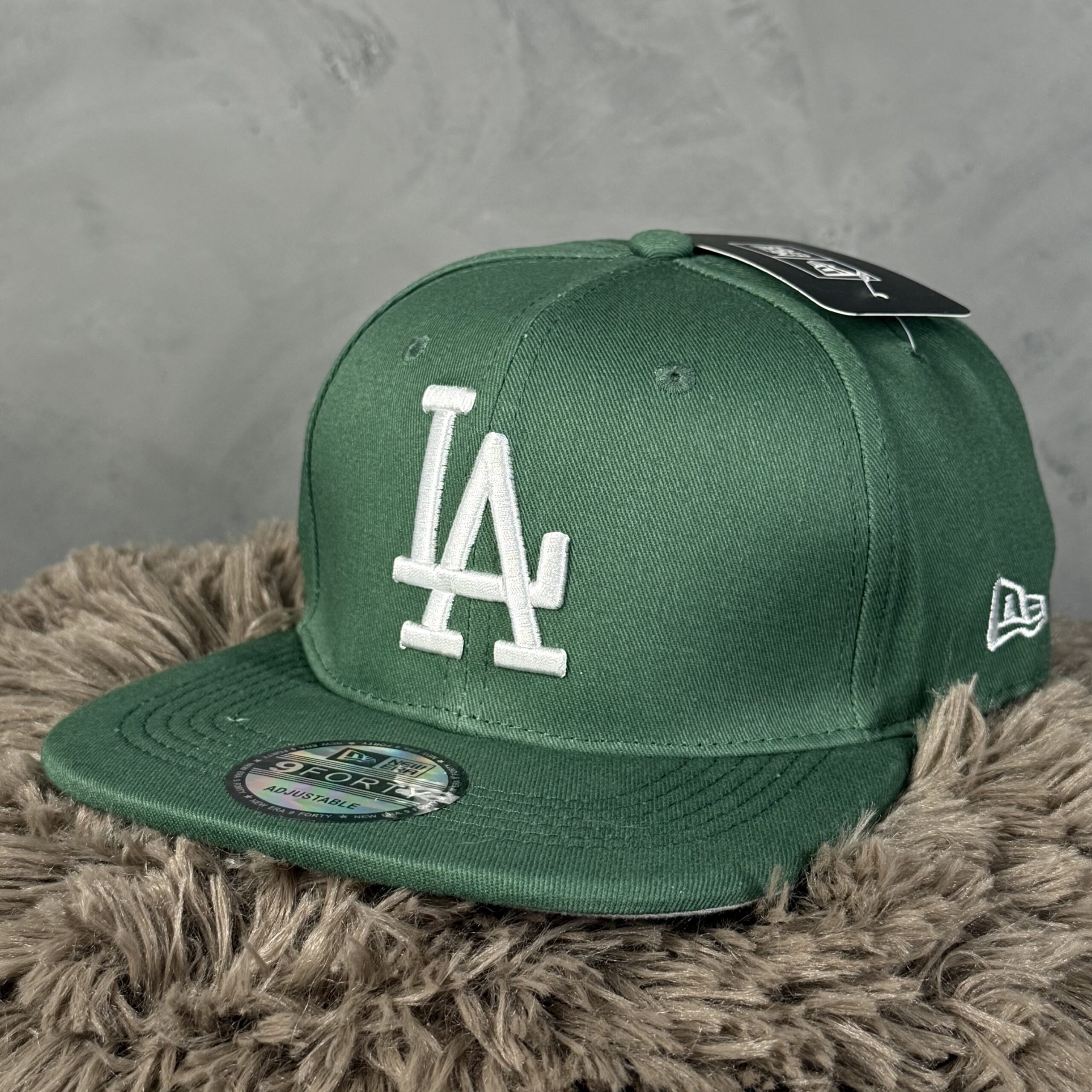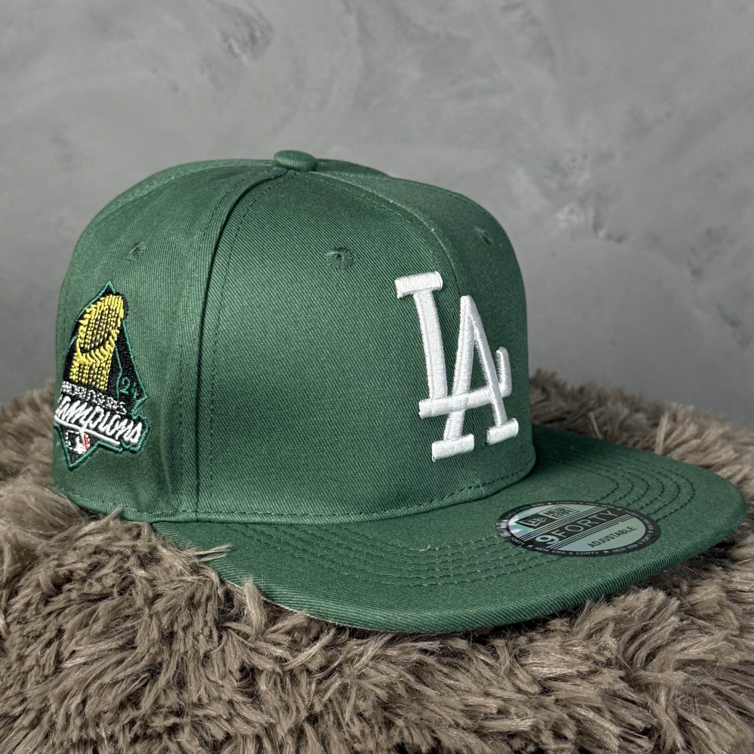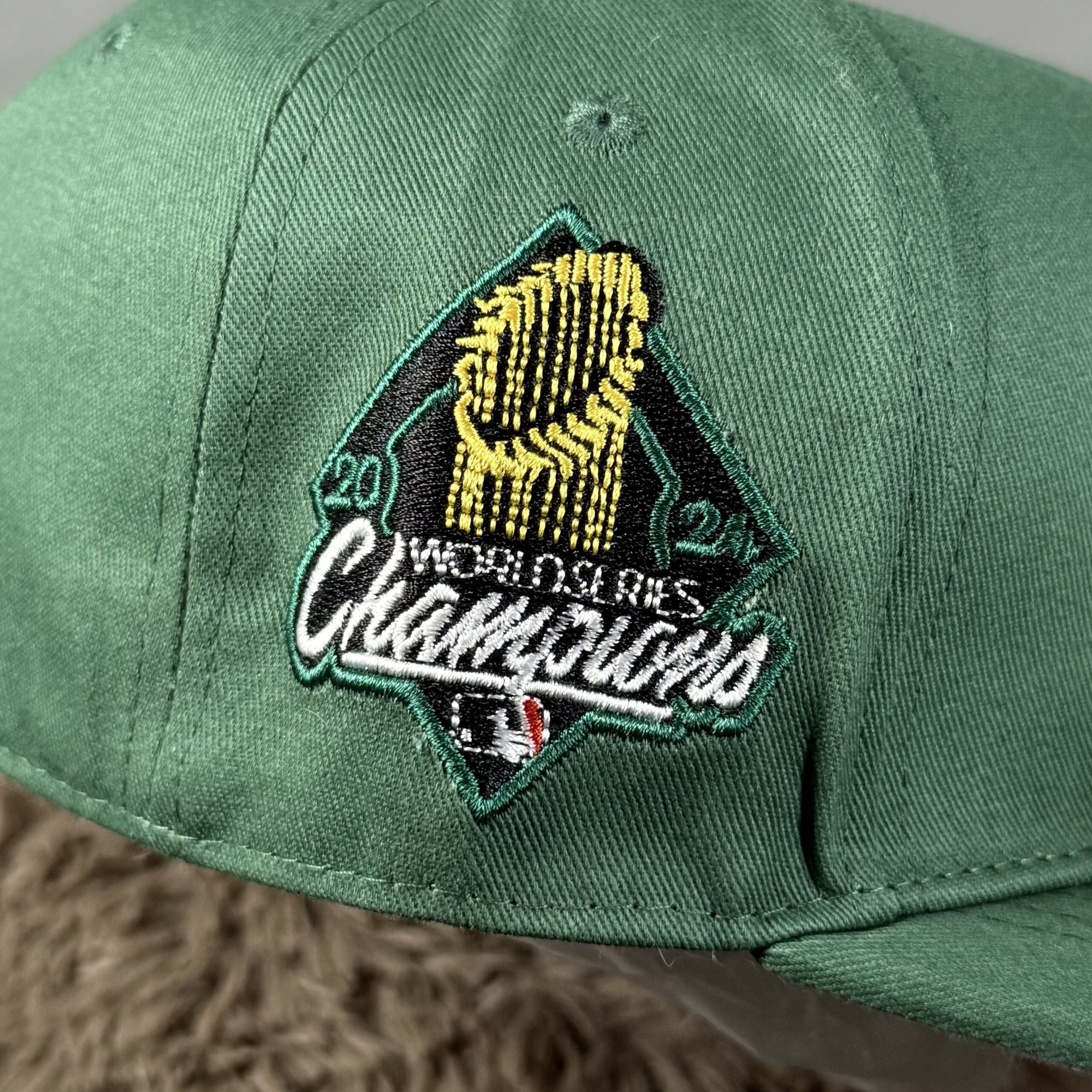 Gorra New Era 9FORTY color verde, con bordado LA en blanco al frente y parche lateral World Series Champions 2024. Modelo ajustable, cómoda para uso diario y con estética streetwear.