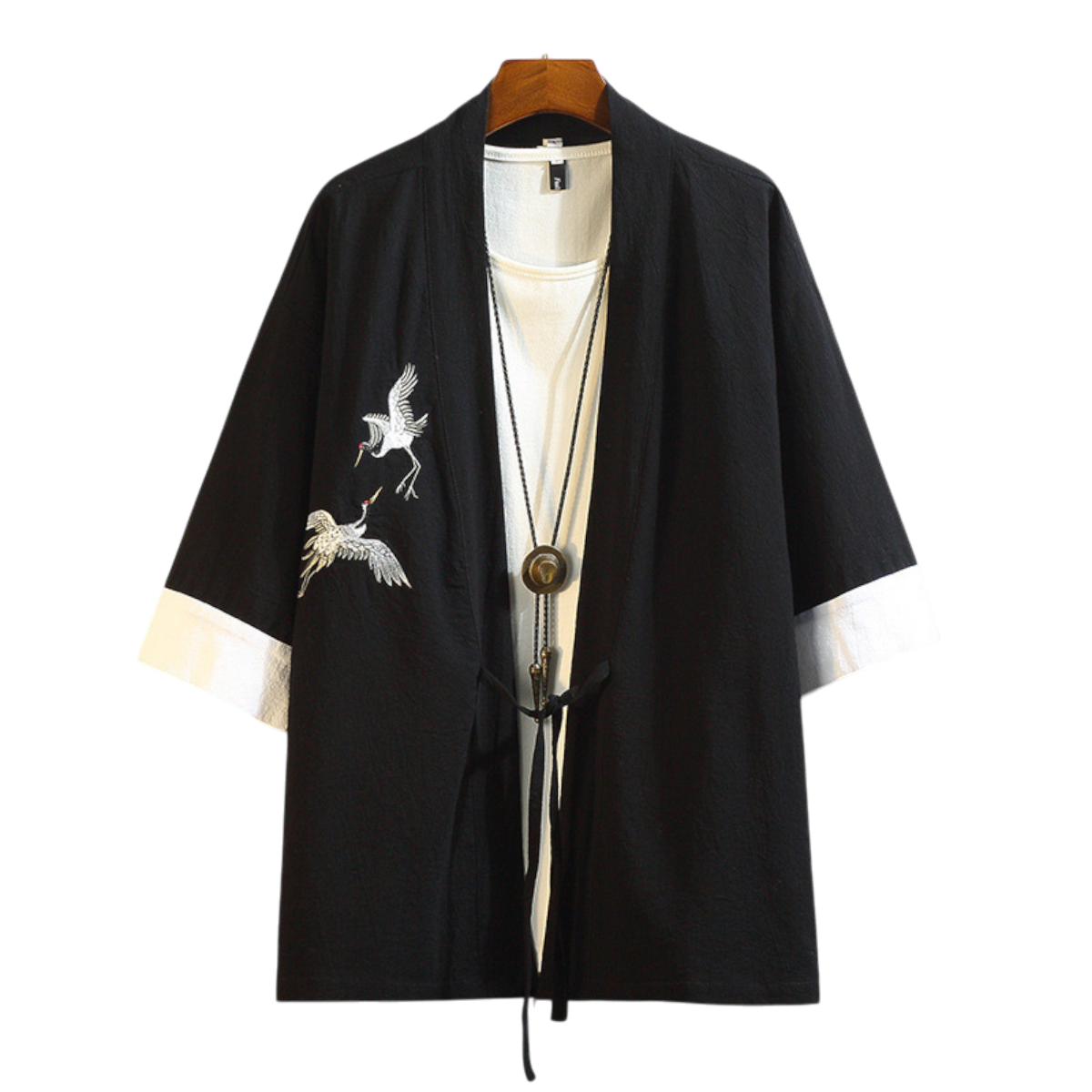 Haori unisex de lino con bordado de grullas en el frente y estética sobria. Puños en contraste y lazo frontal para ajustar. Un básico japonés moderno: combina con todo y suma presencia sin ser cargado.