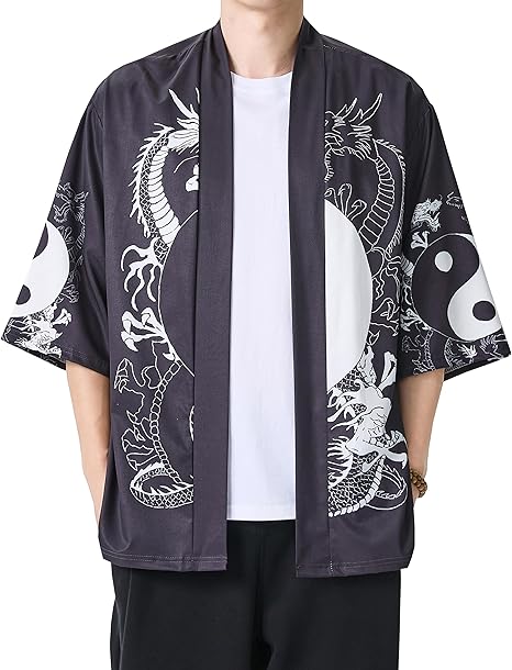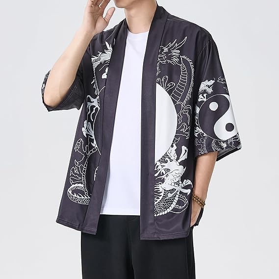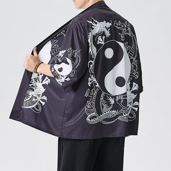 Haori de poliéster estilo japonés en negro con estampa XL de Yin Yang y dragones en contraste que se llevan toda la atención. Tiene una vibra oriental fuerte, oscura y moderna: ideal para levantar un outfit urbano sin pensar demasiado. Calce suelto tipo kimono, pensado para usar abierto arriba de remera, musculosa o buzo fino y sumar capa con mucha presencia.