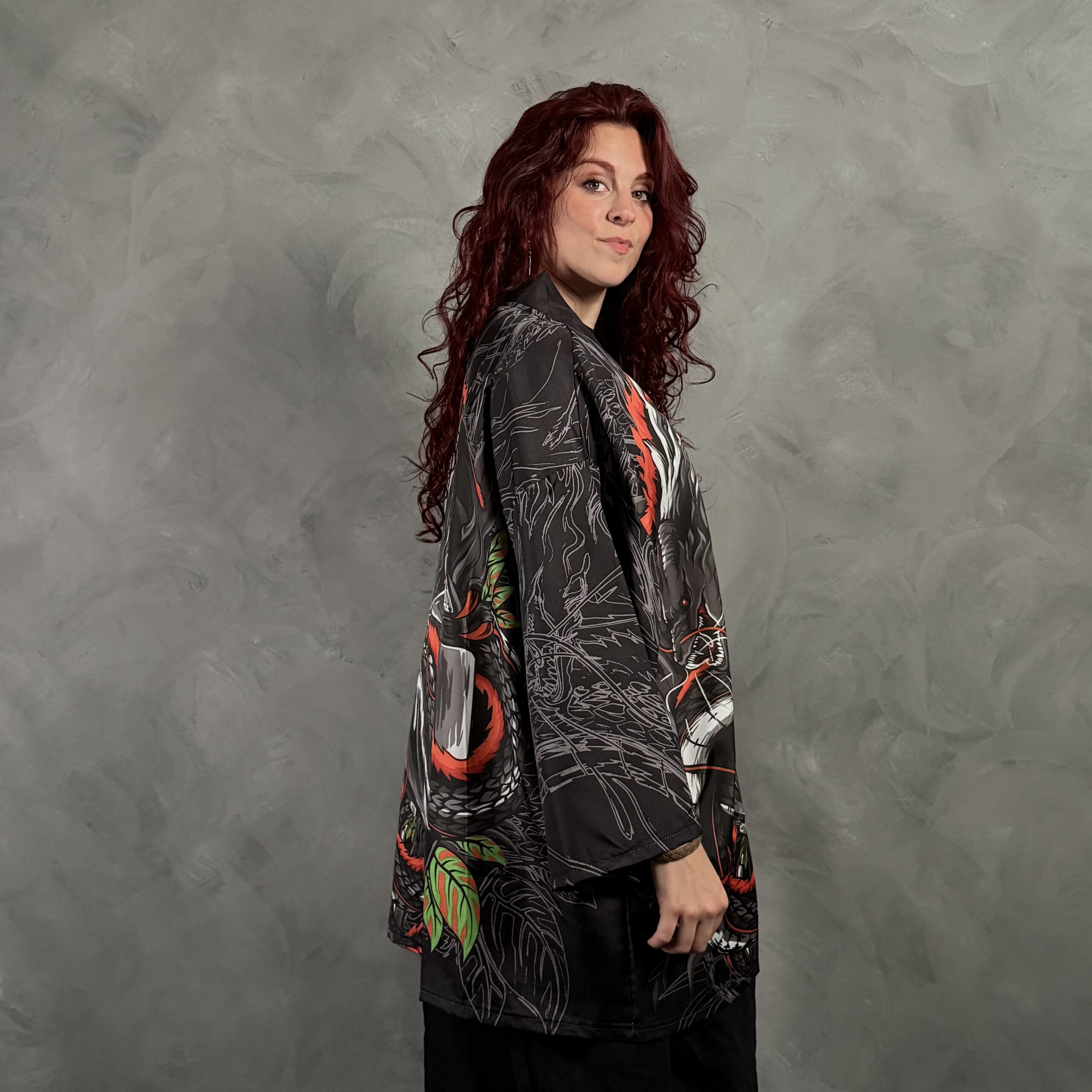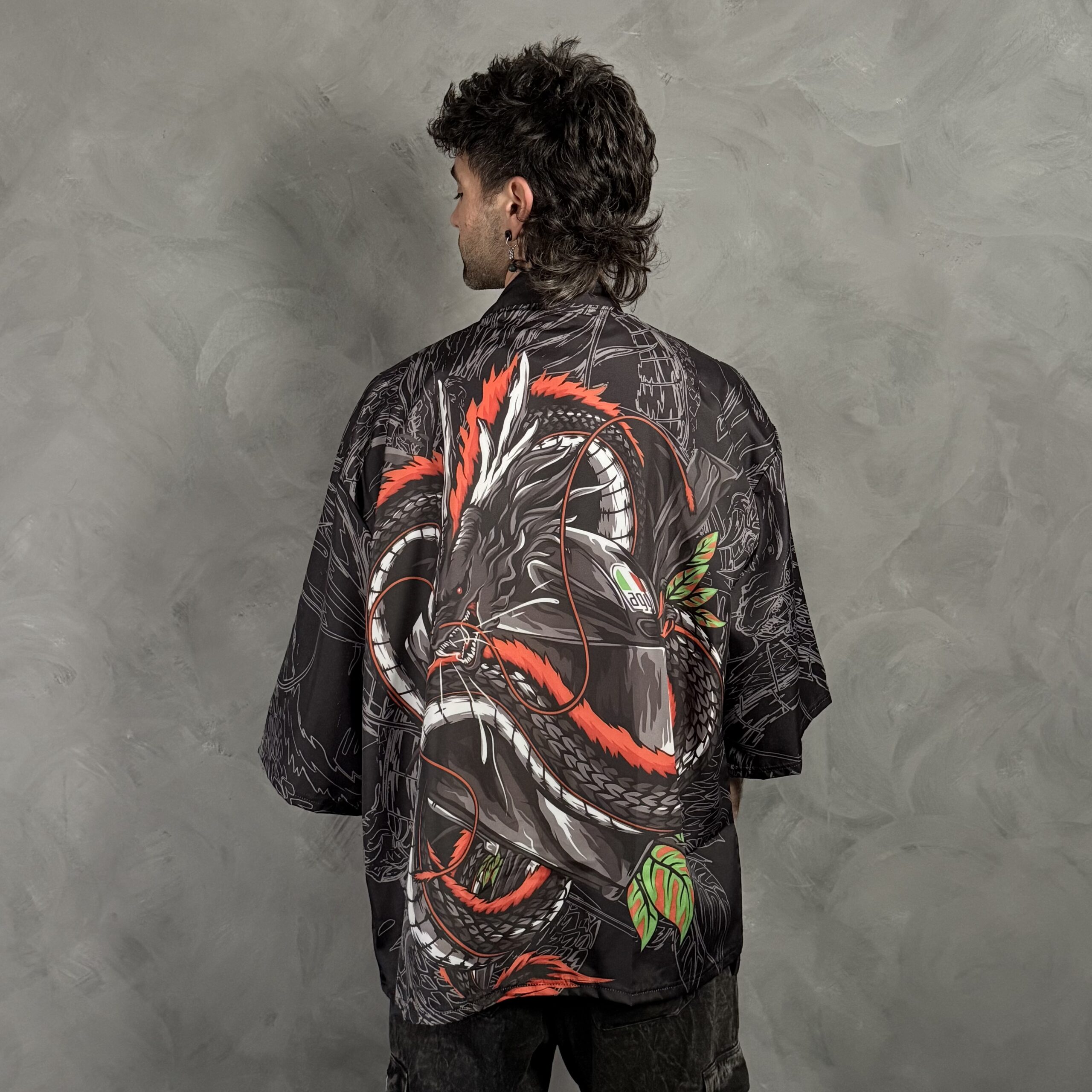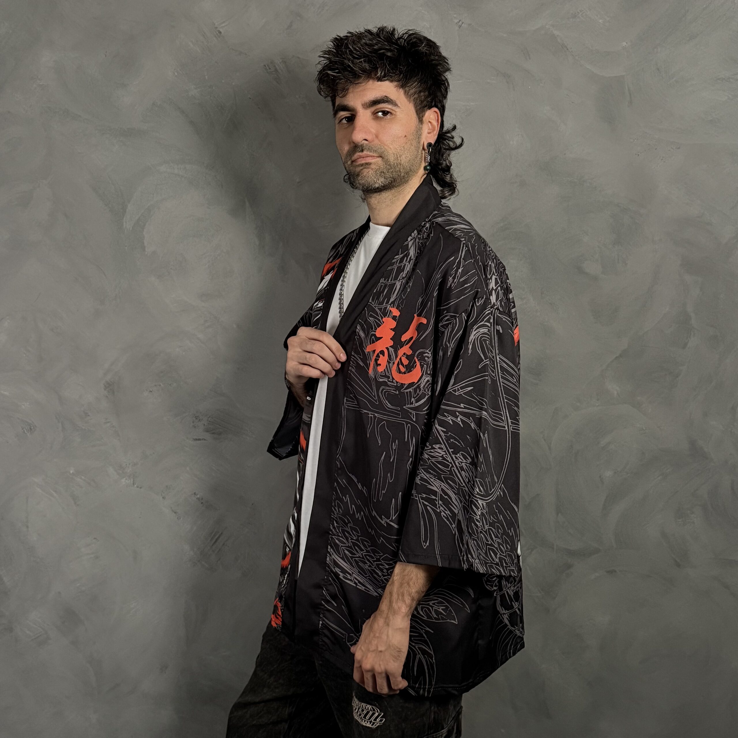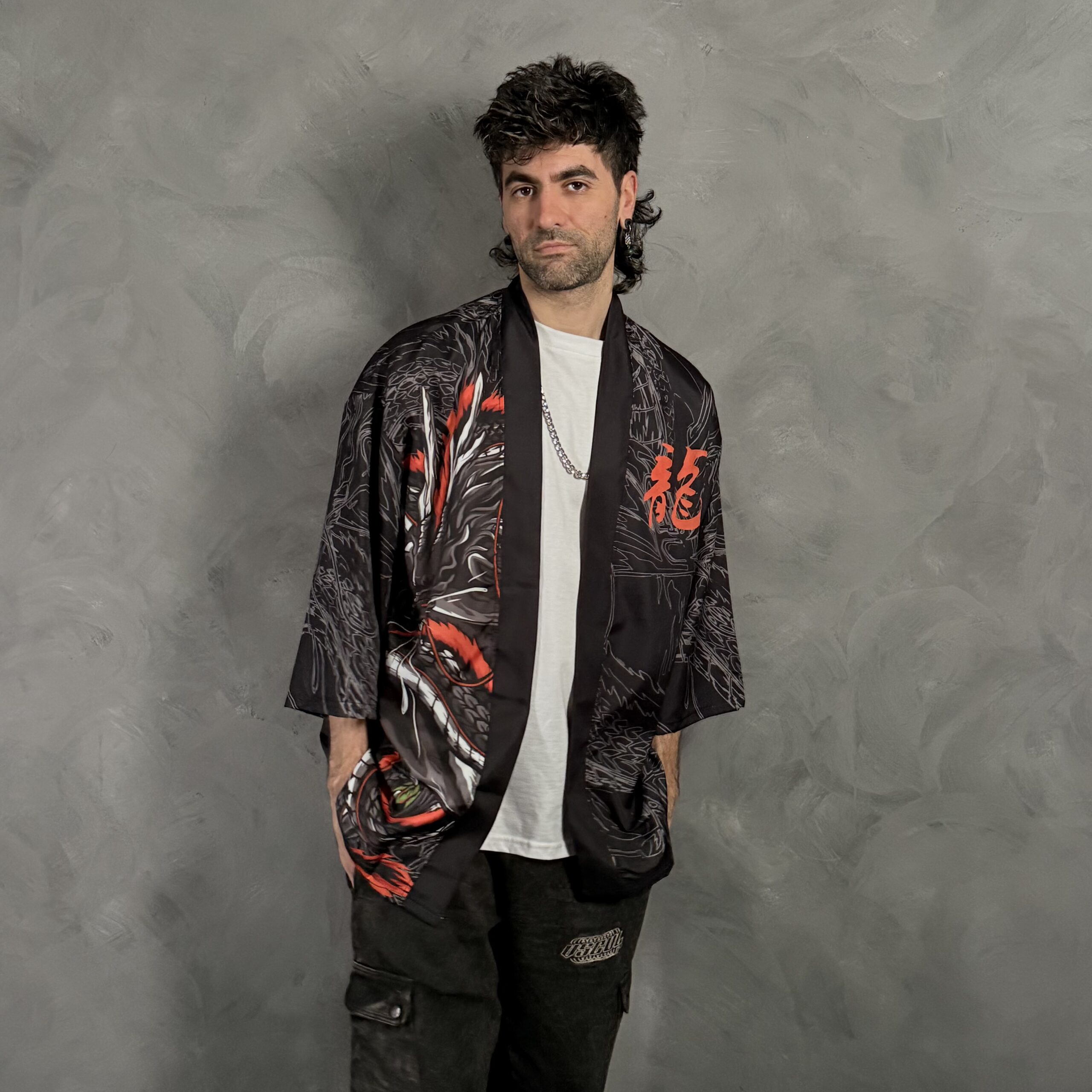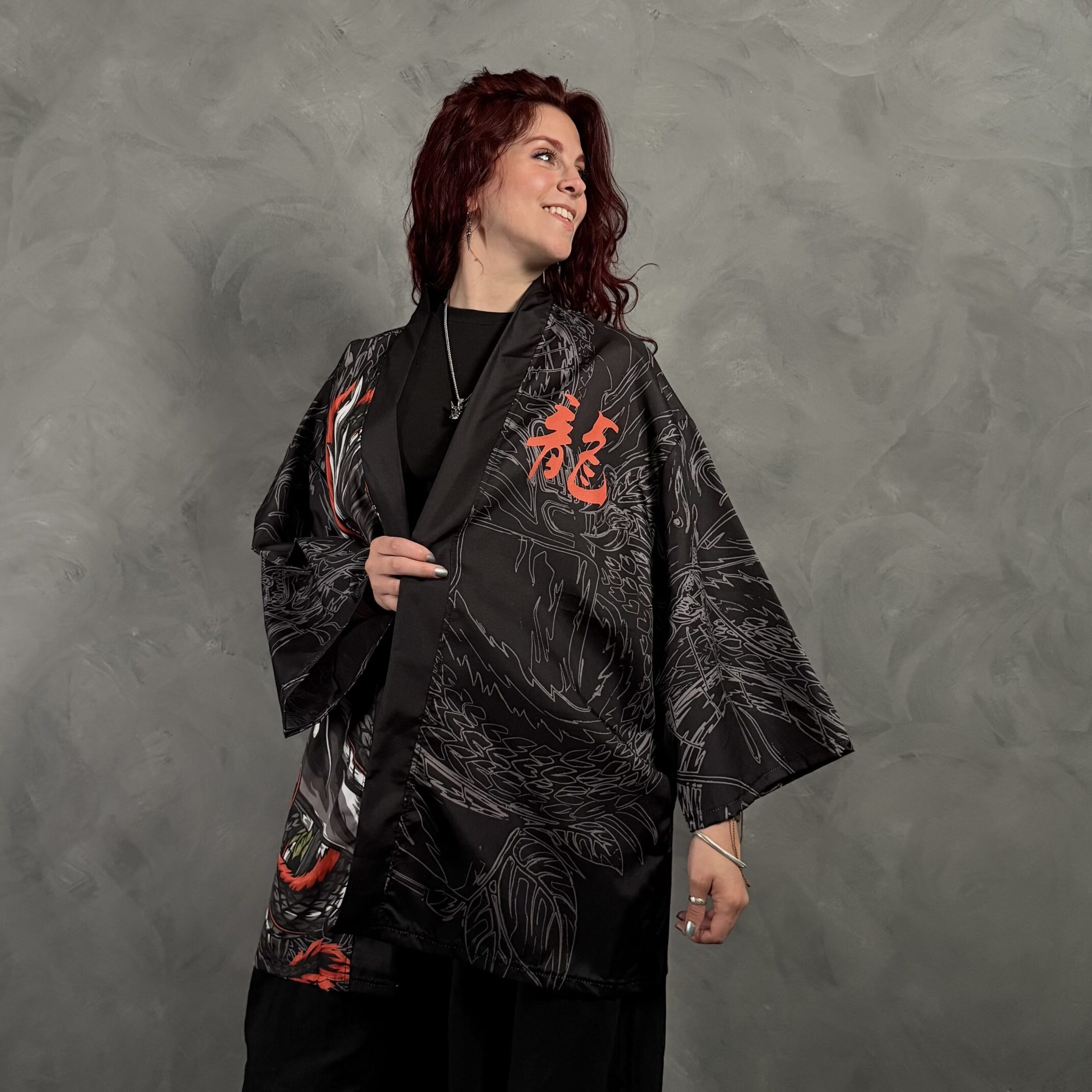 Haori oversize de poliéster con diseño de dragón negro y detalles en rojo intenso. Corte fluido y liviano, ideal para outfits urbanos con estilo oriental.