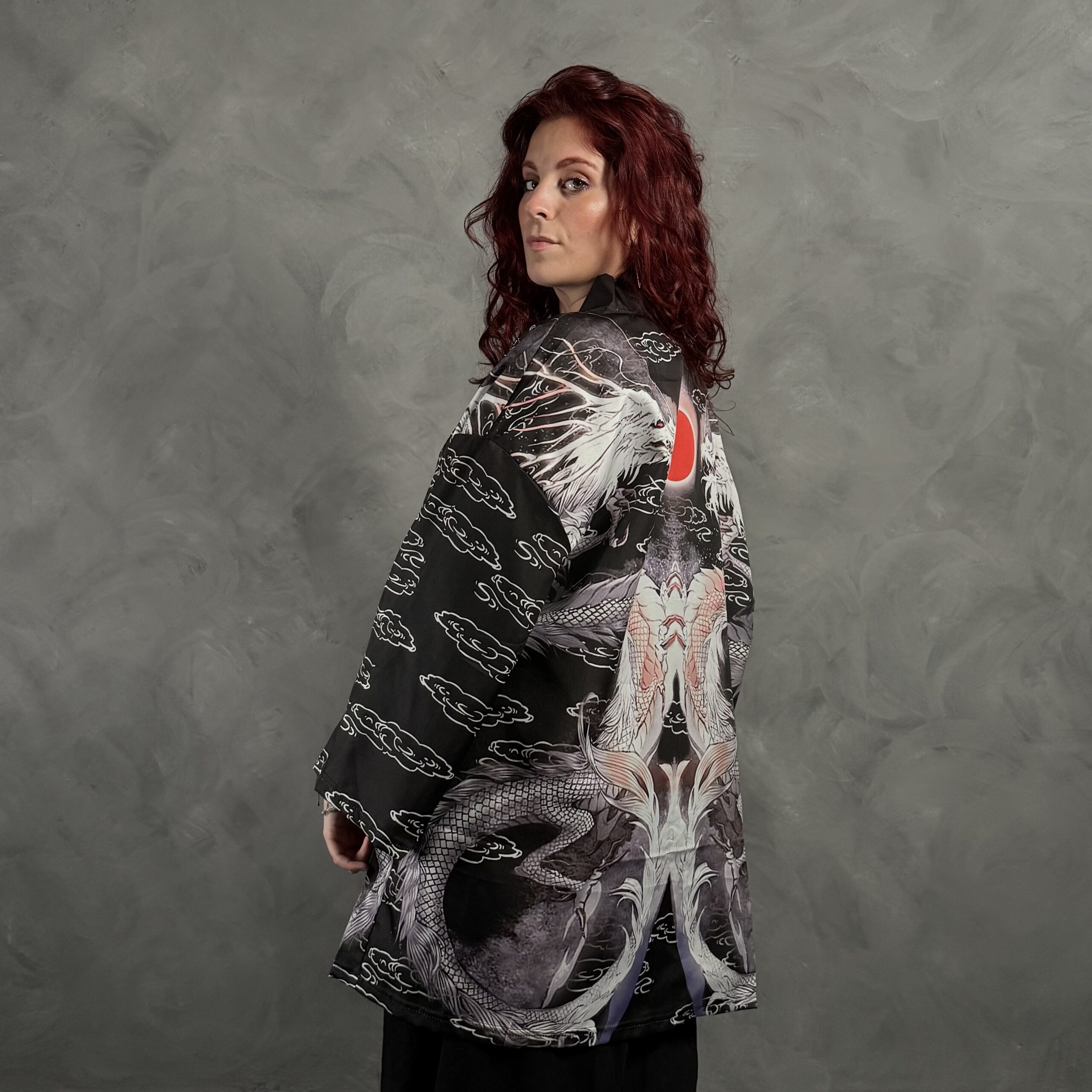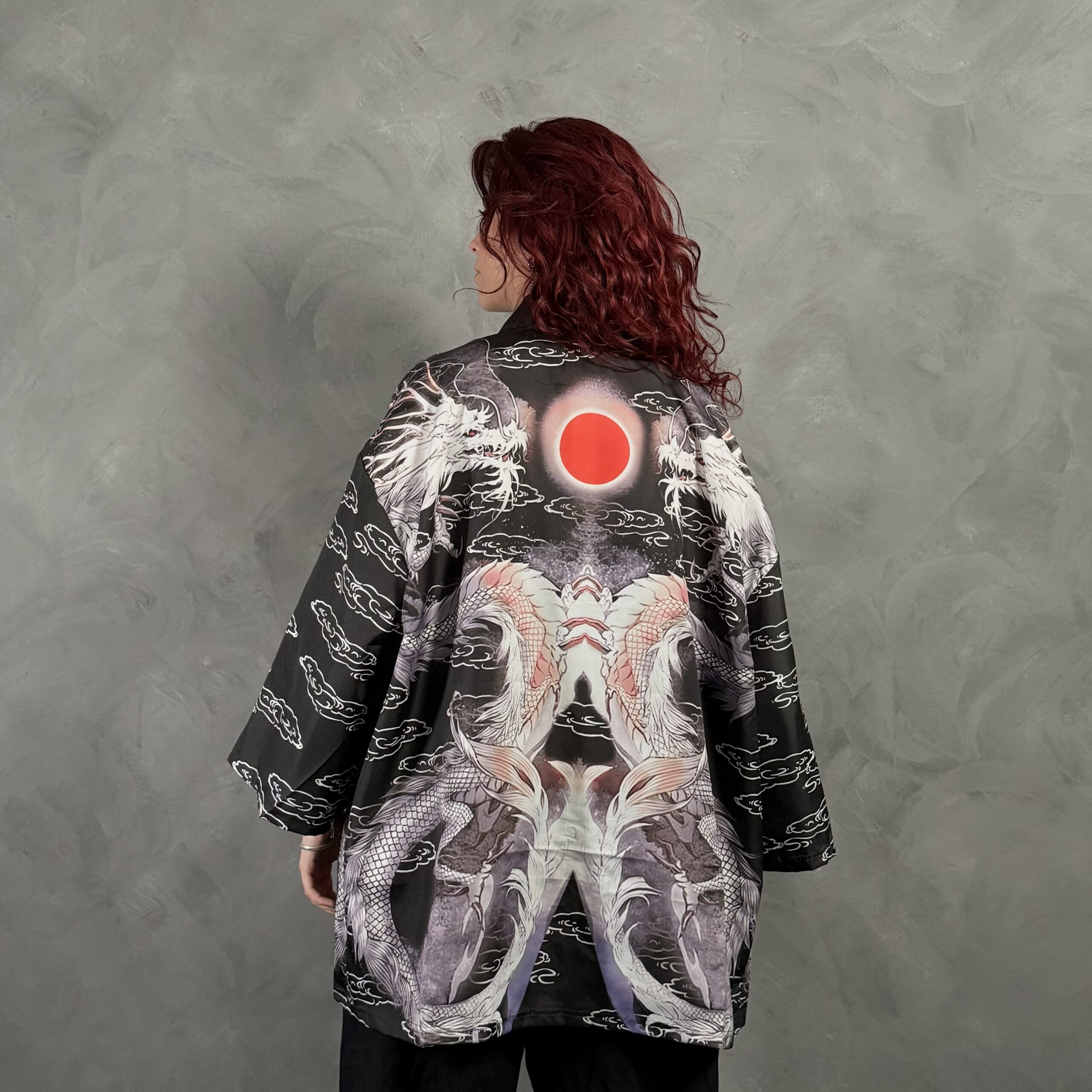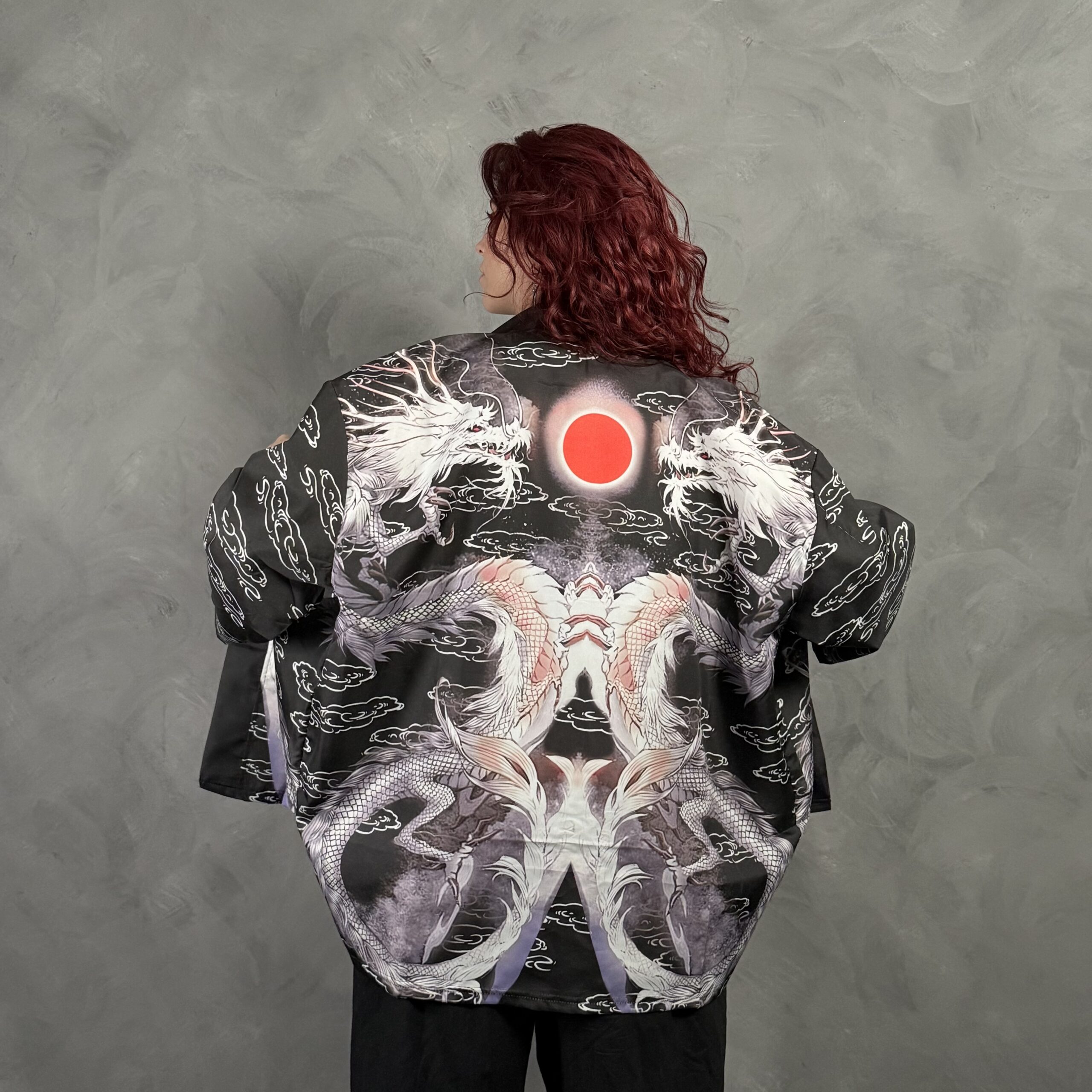 Haori oversize con dragones blancos enfrentados y sol rojo en el centro. Simboliza equilibrio y fuerza. Hecho en poliéster suave.