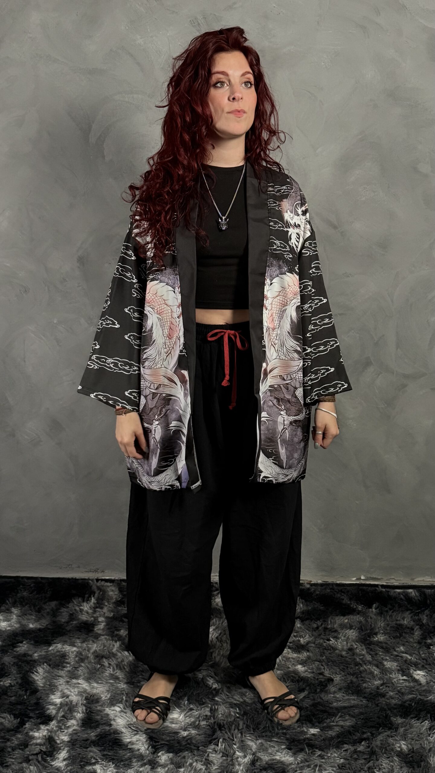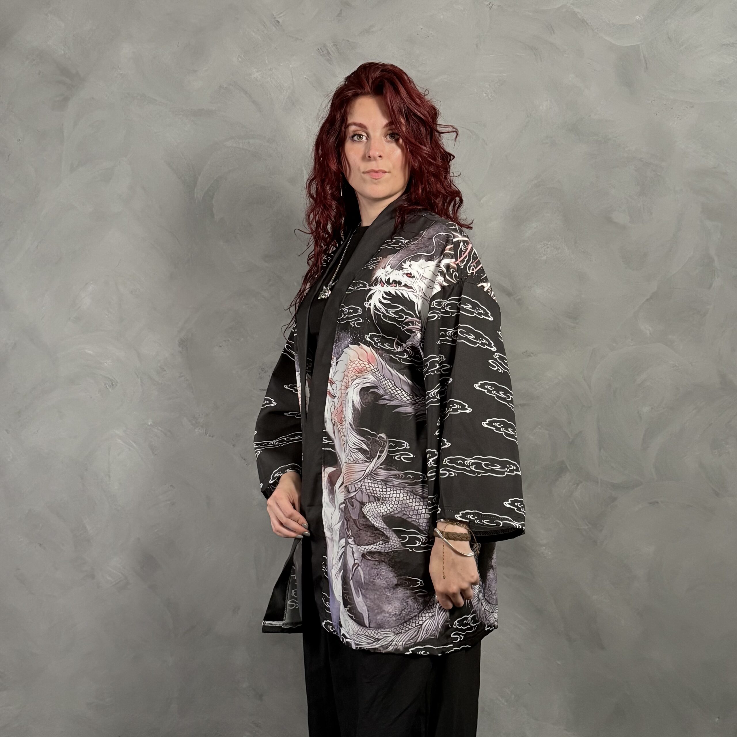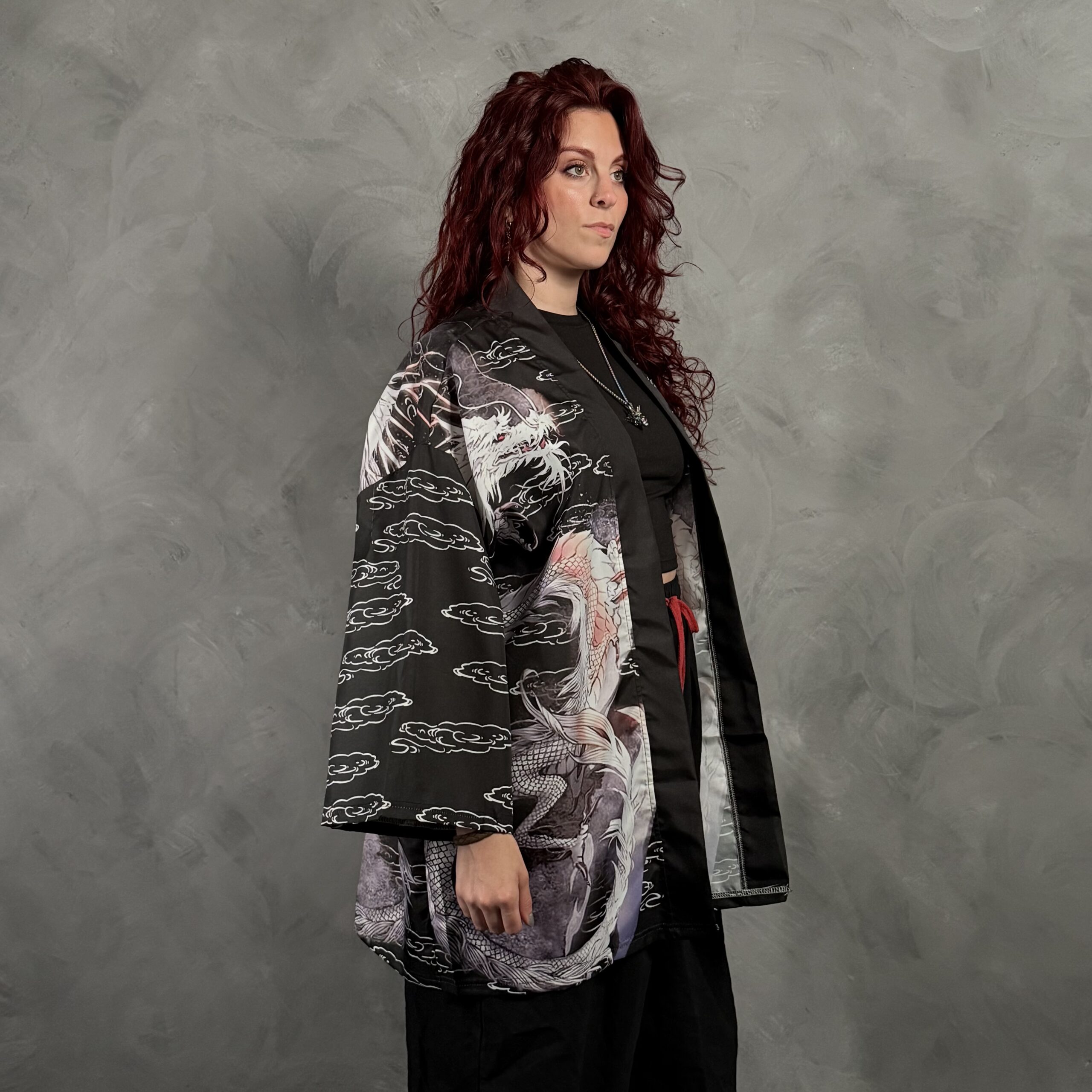 Haori oversize con dragones blancos enfrentados y sol rojo en el centro. Simboliza equilibrio y fuerza. Hecho en poliéster suave.