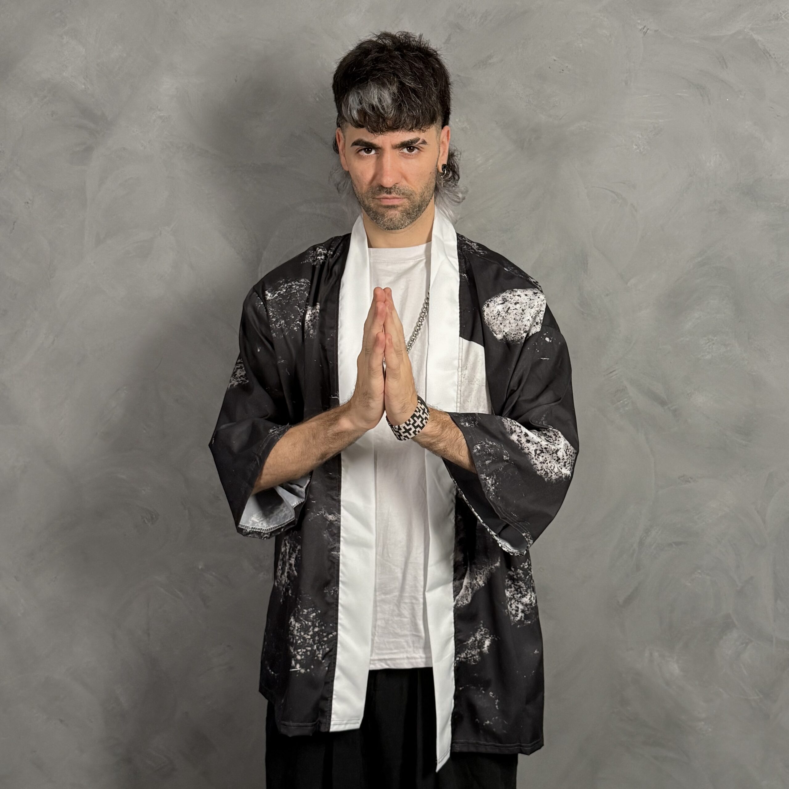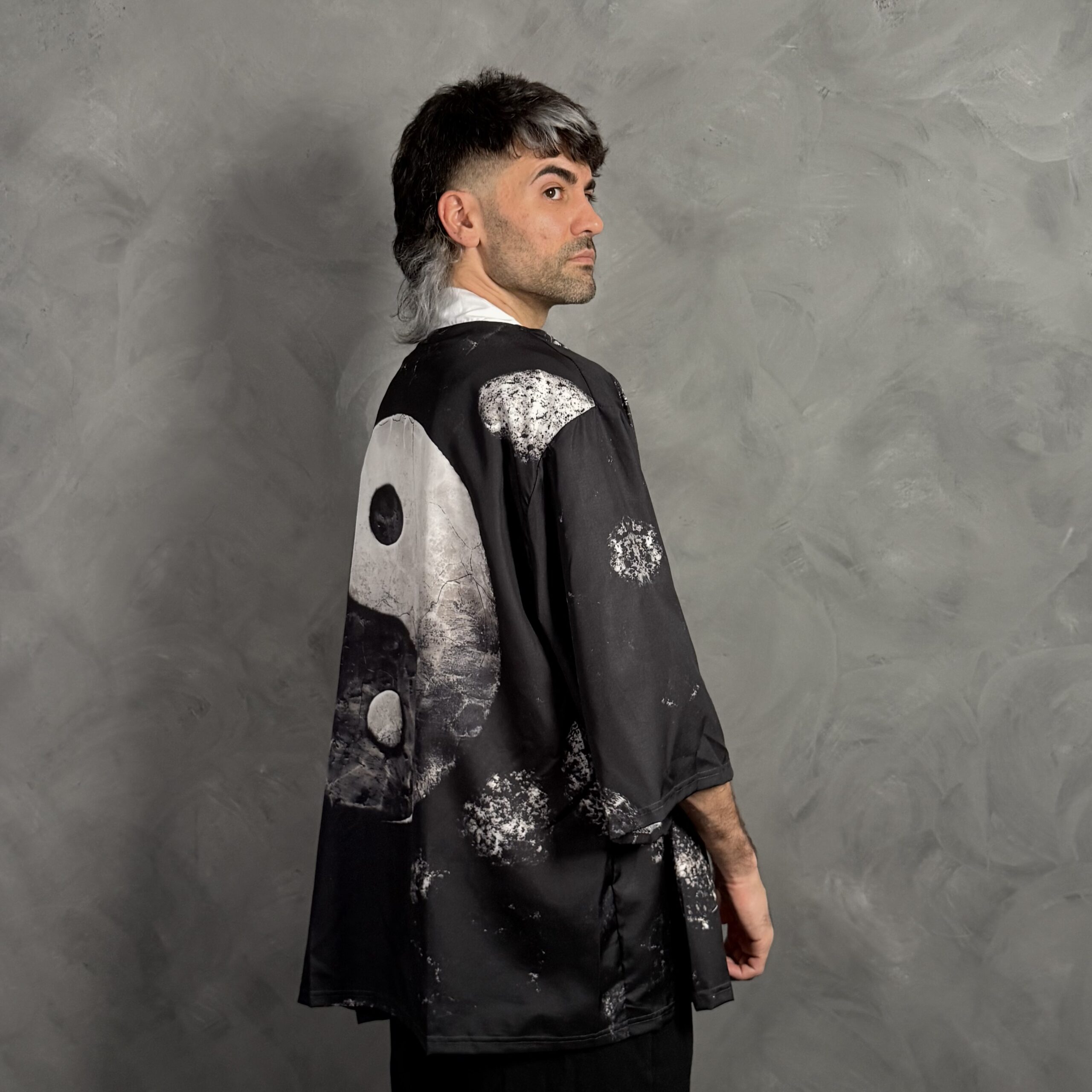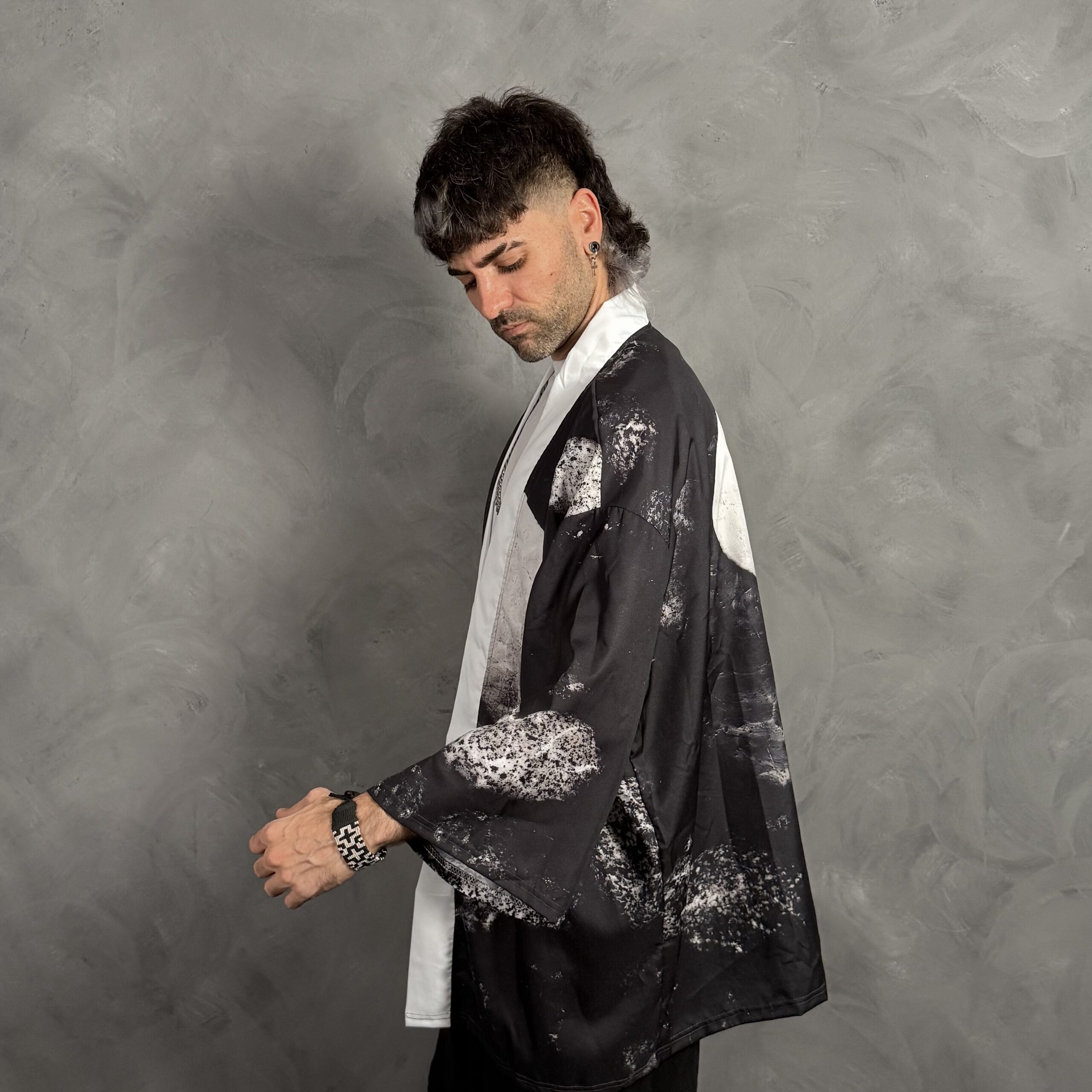 Haori unisex de corte amplio con diseño marmolado en blanco y negro, ideal para sumar estilo a cualquier outfit urbano.