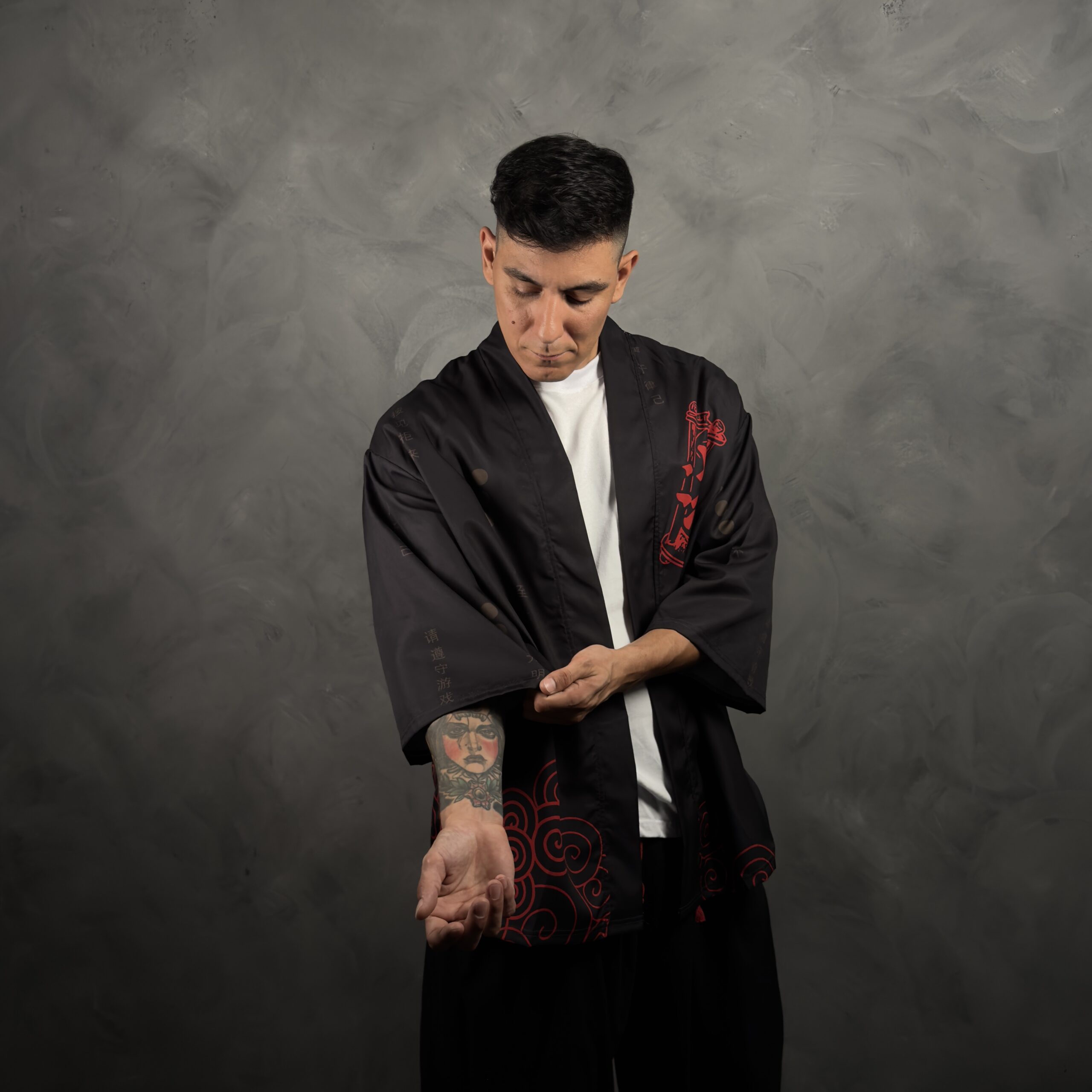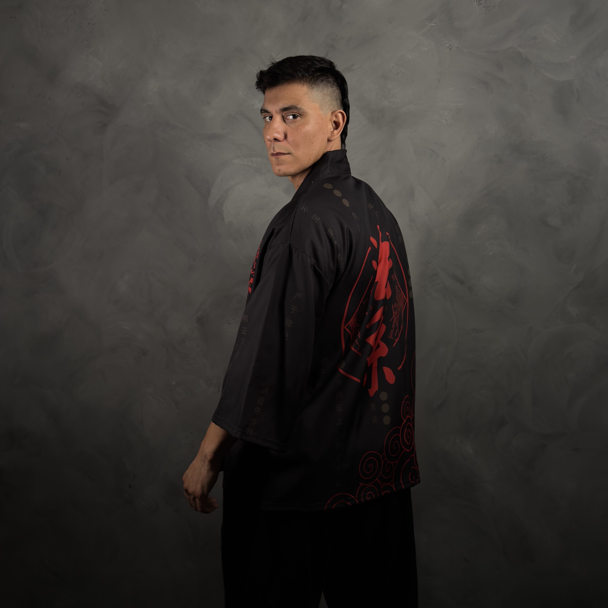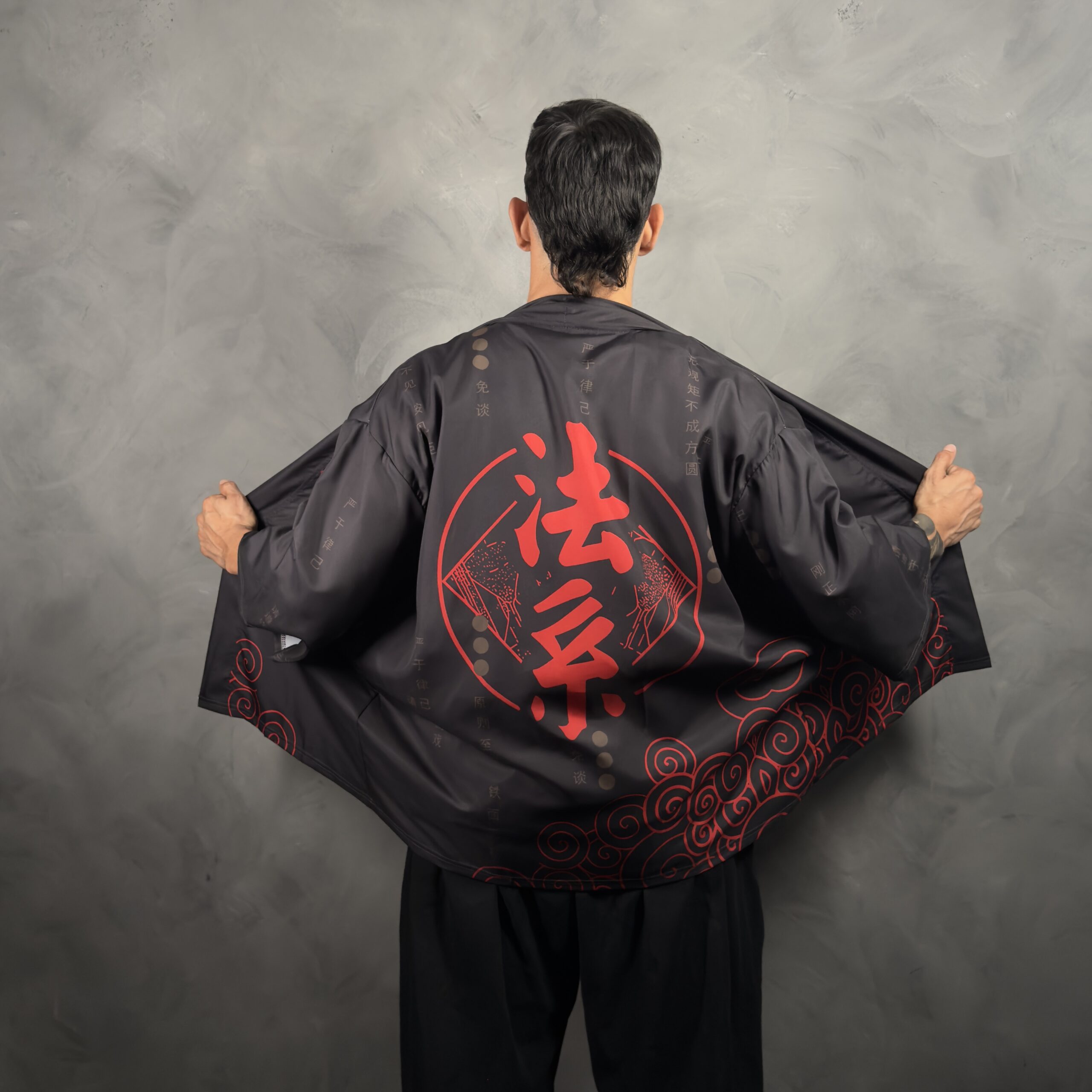 Haori de poliéster estilo japonés en negro con un diseño minimalista y oscuro, donde el protagonista es el kanji rojo XL “法家” en la espalda. Lleva detalles de escritura tonal (negro sobre negro) y un patrón de nubes rojas en espiral en la parte baja que suma estética sin recargar. Calce suelto tipo kimono, ideal para usar abierto arriba de remera, musculosa o buzo fino y levantar el outfit al toque.