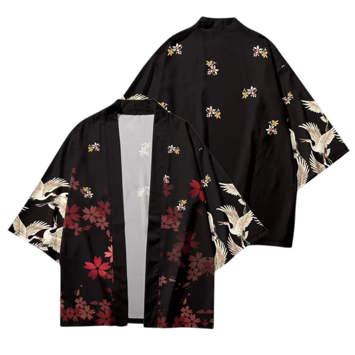 Haori unisex de poliéster, liviano y de caída fluida, estilo kimono abierto al frente. Estampado con grullas y flores en tonos rojo/negro, mezcla perfecta entre clásico japonés y streetwear. Recomendado para looks nocturnos o monocromo.