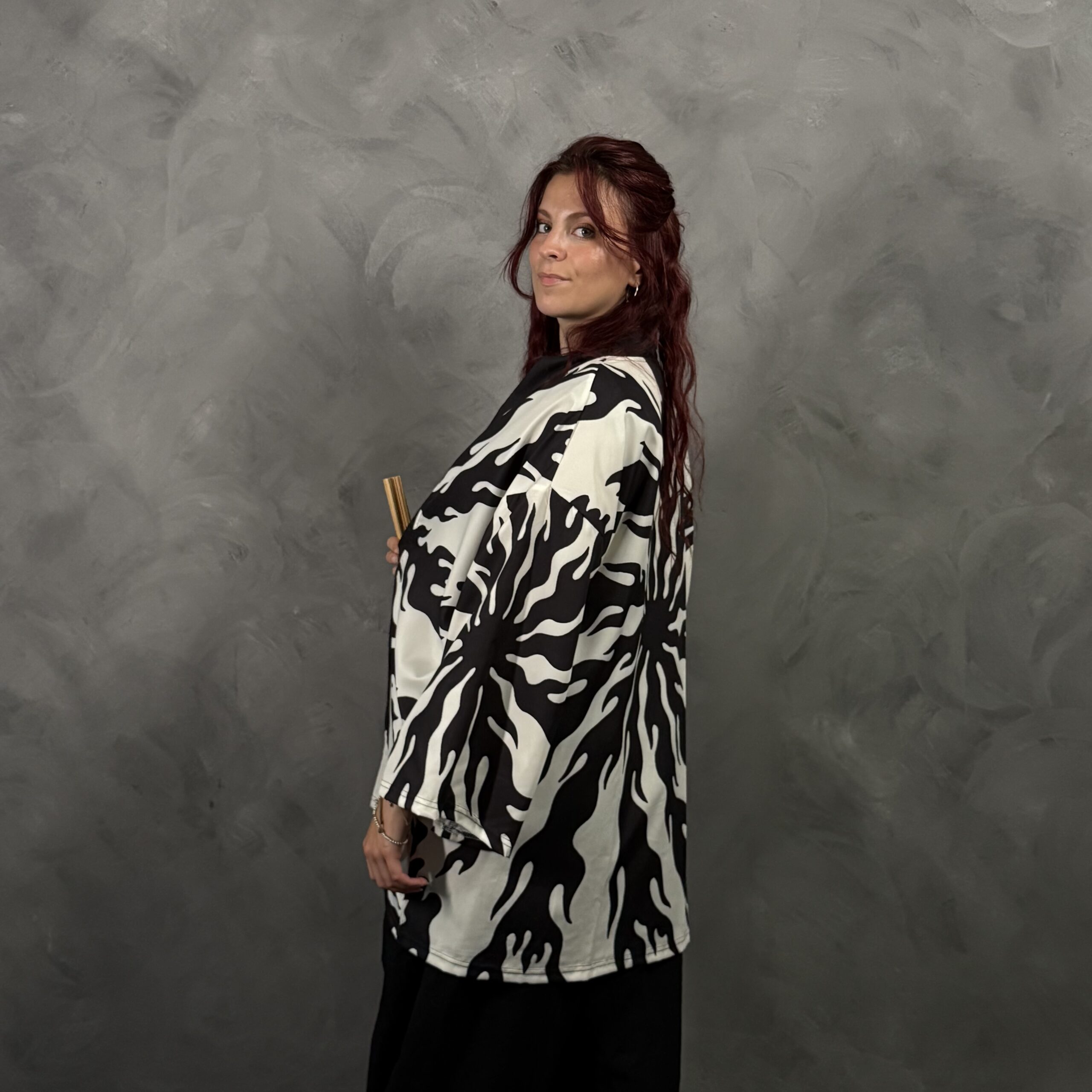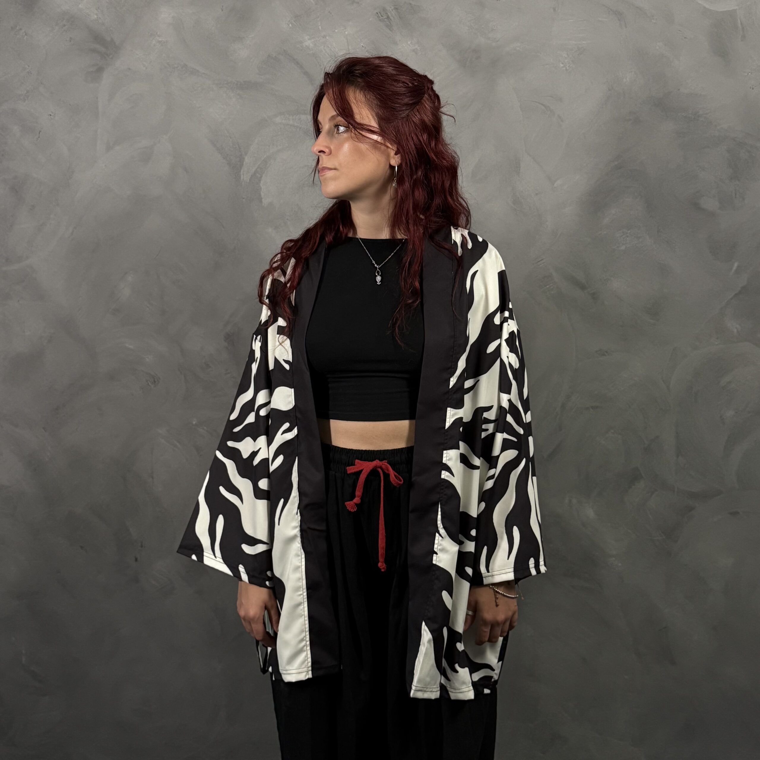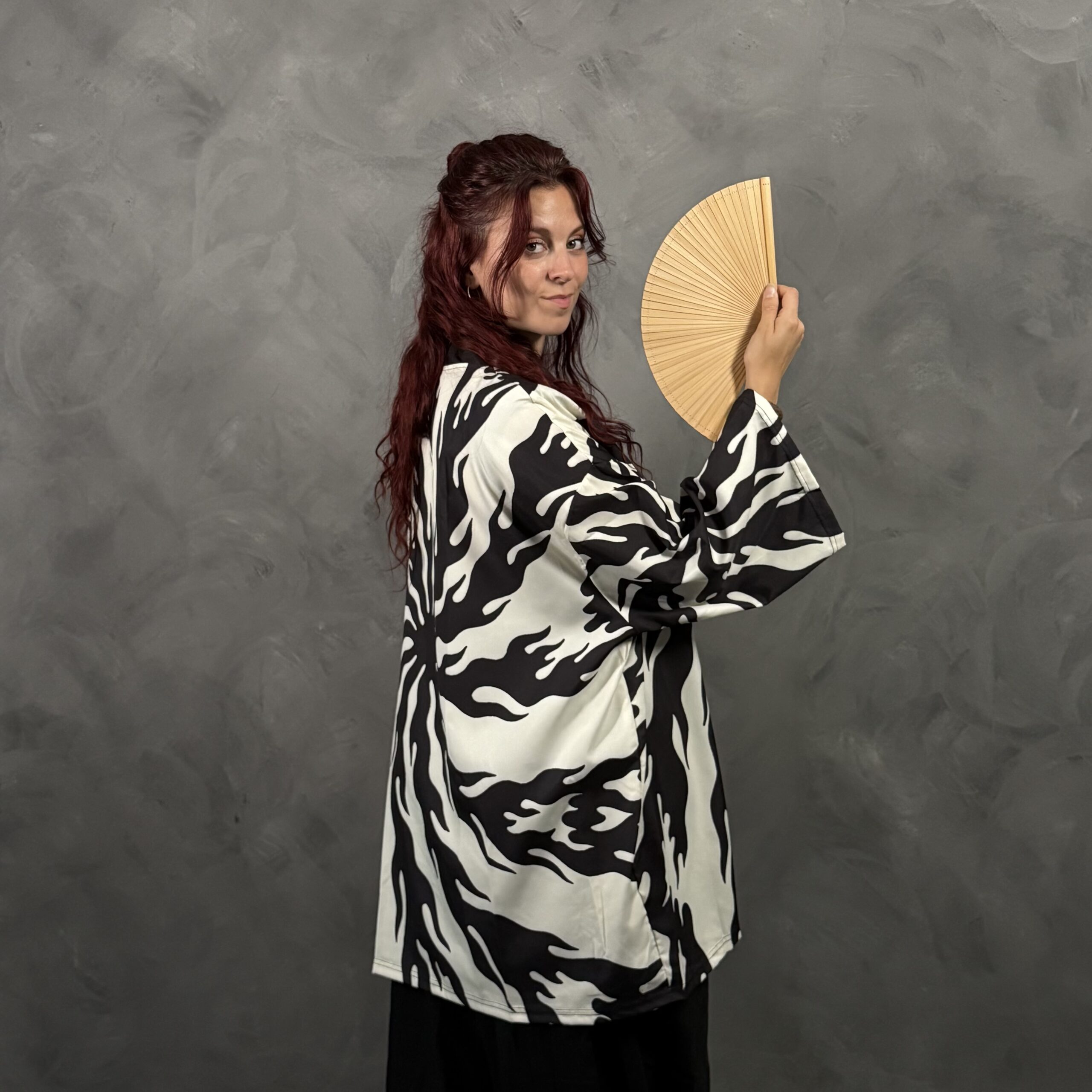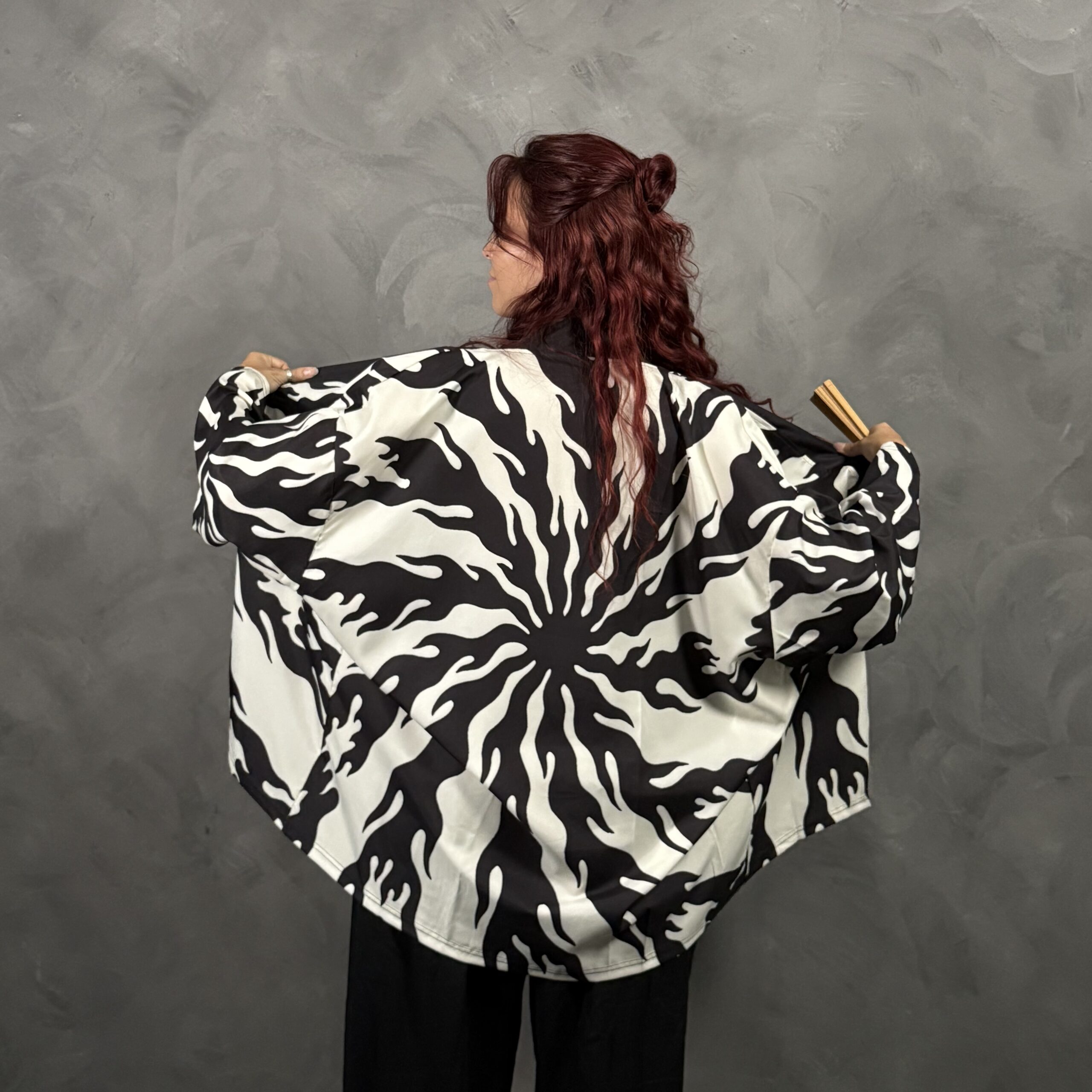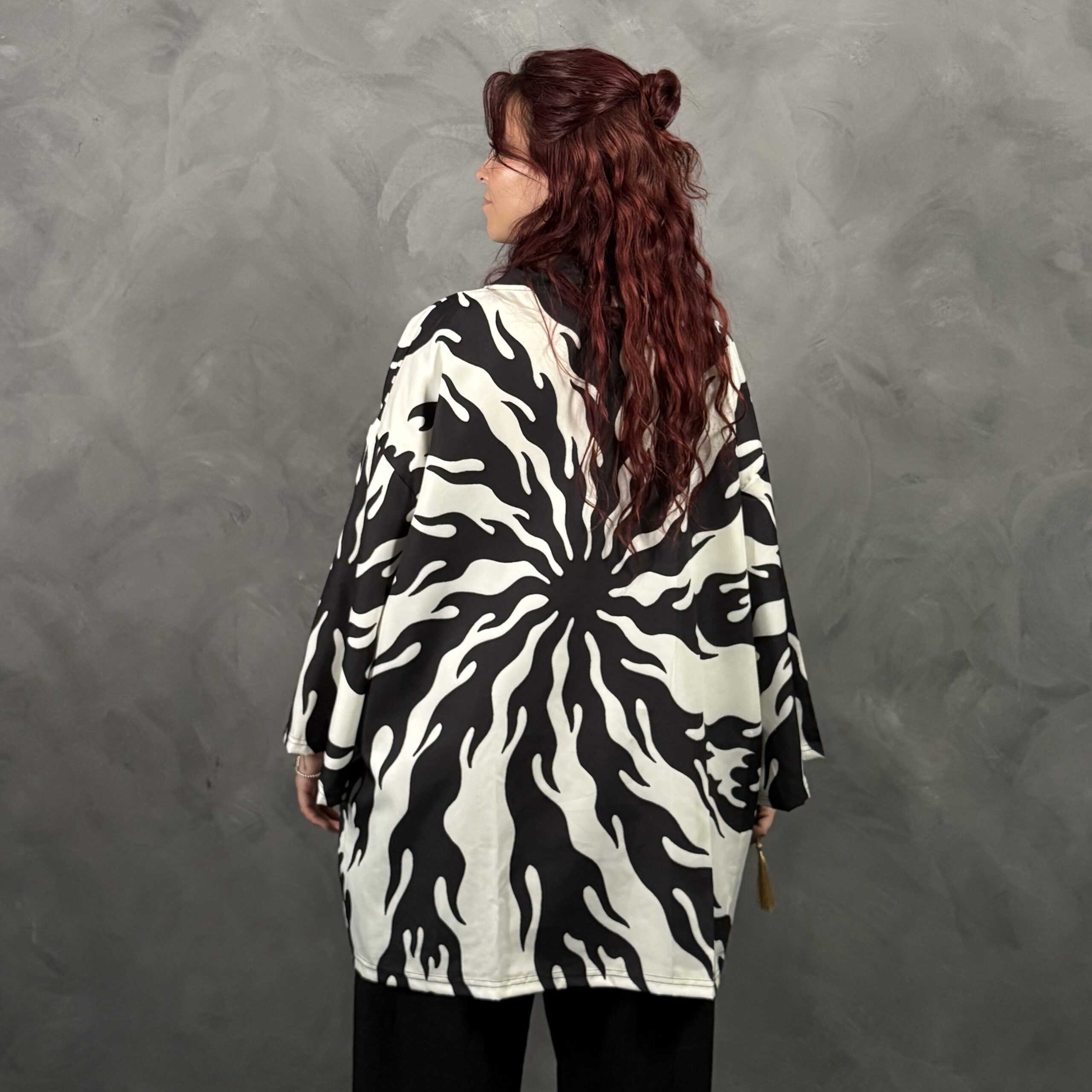 Haori unisex de poliéster con calce relajado tipo kimono, abierto al frente. Estampado en blanco y negro estilo llamas/torbellino, muy gráfico y moderno, ideal para looks monocromo o para cortar un outfit básico. Recomendado: lavado suave.