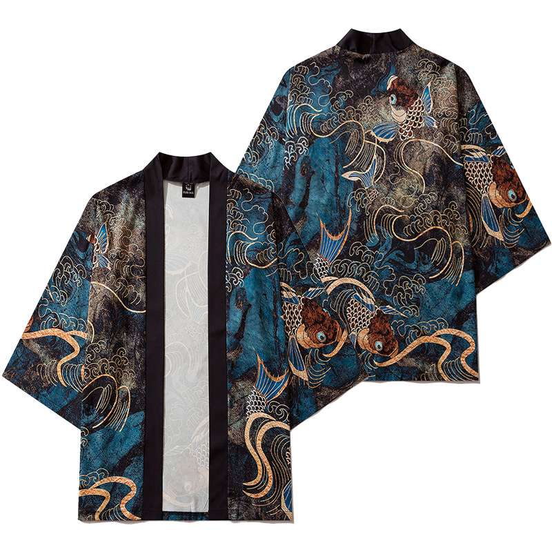 Haori unisex de poliéster con estética japonesa clásica. Fondo azul texturado con koi y líneas en tono bronce/dorado, un diseño con mucho detalle que levanta cualquier outfit sin necesidad de accesorios. Cuidado: agua fría, sin lavandina, secado a la sombra.