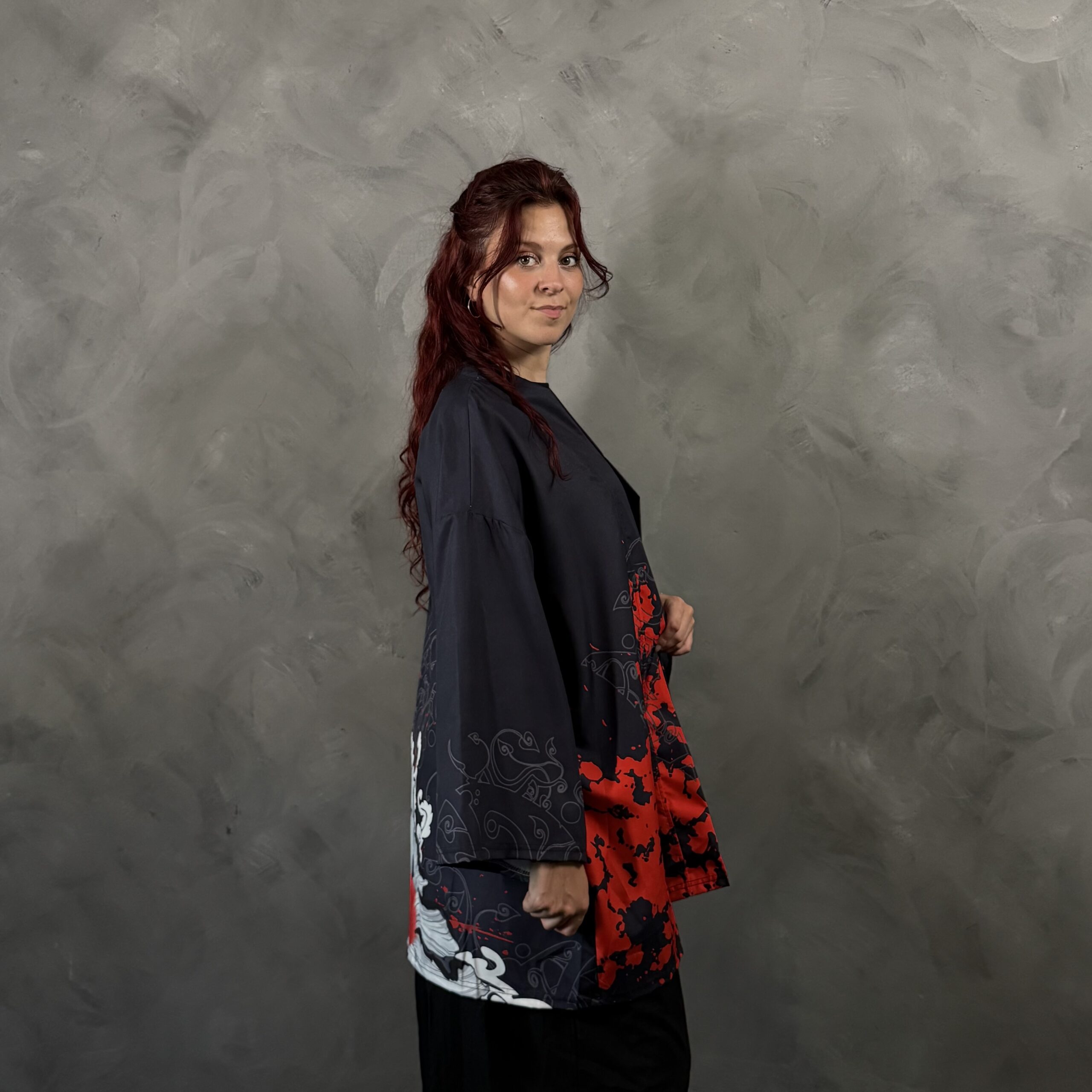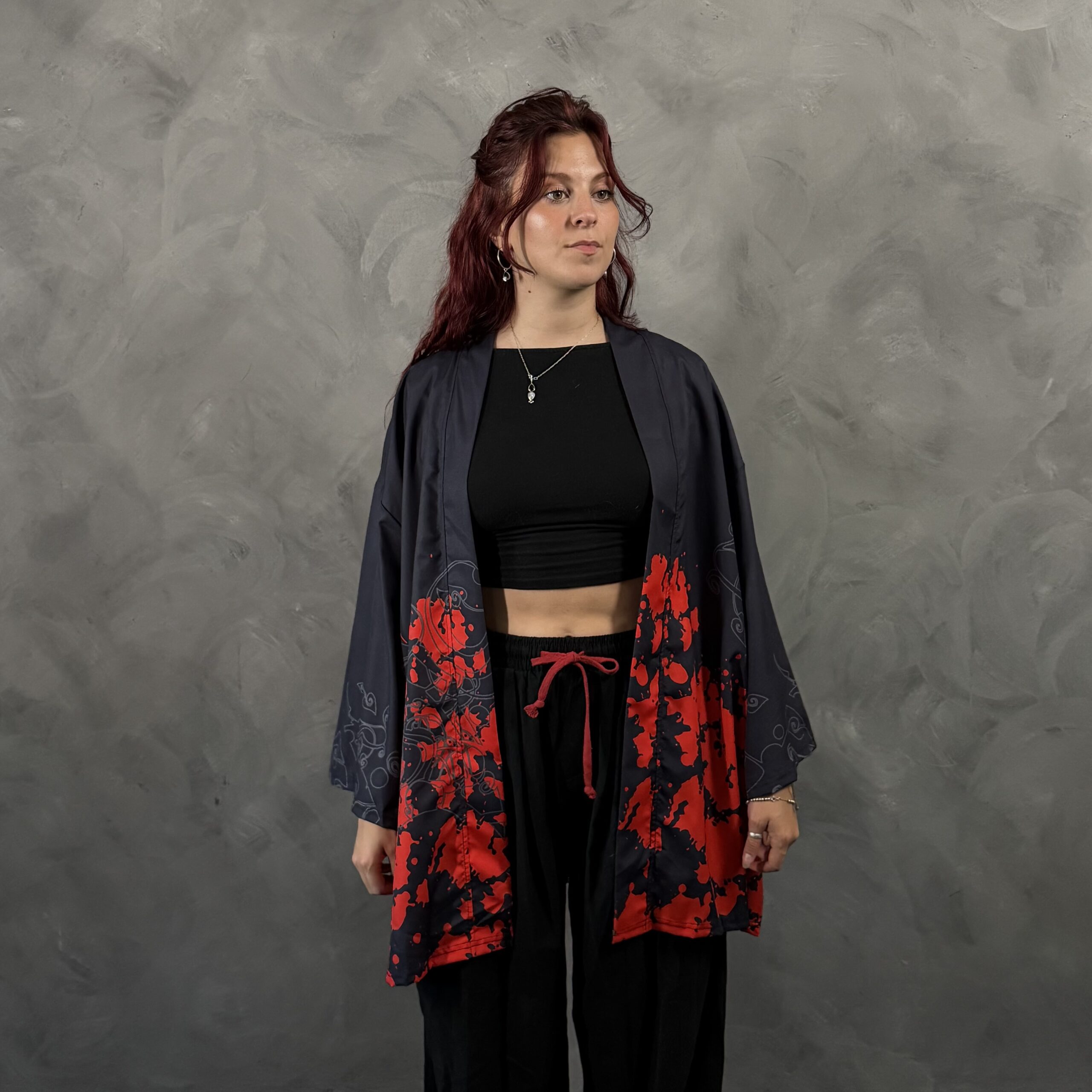 Haori unisex de poliéster, liviano, abierto al frente y con calce cómodo. Gráfica estilo tinta japonesa con koi y detalles en rojo tipo salpicado, combinando elegancia y actitud. Ideal para layering con remera lisa y pantalón cargo o jean.