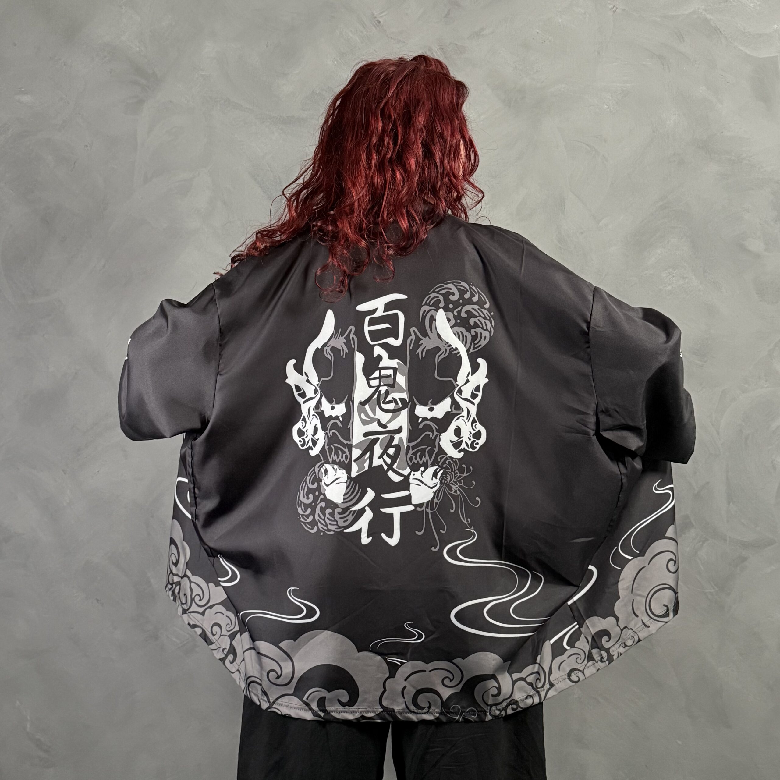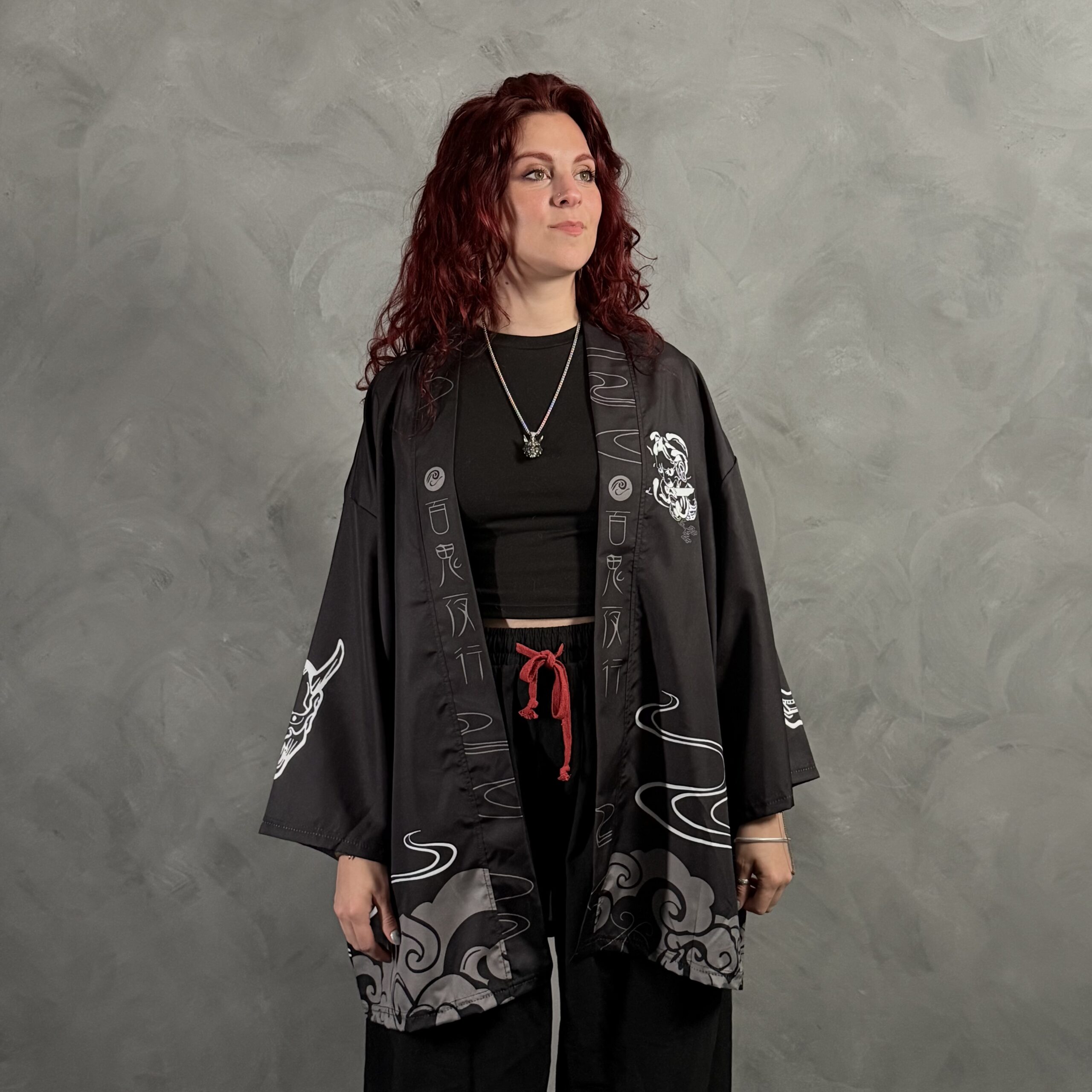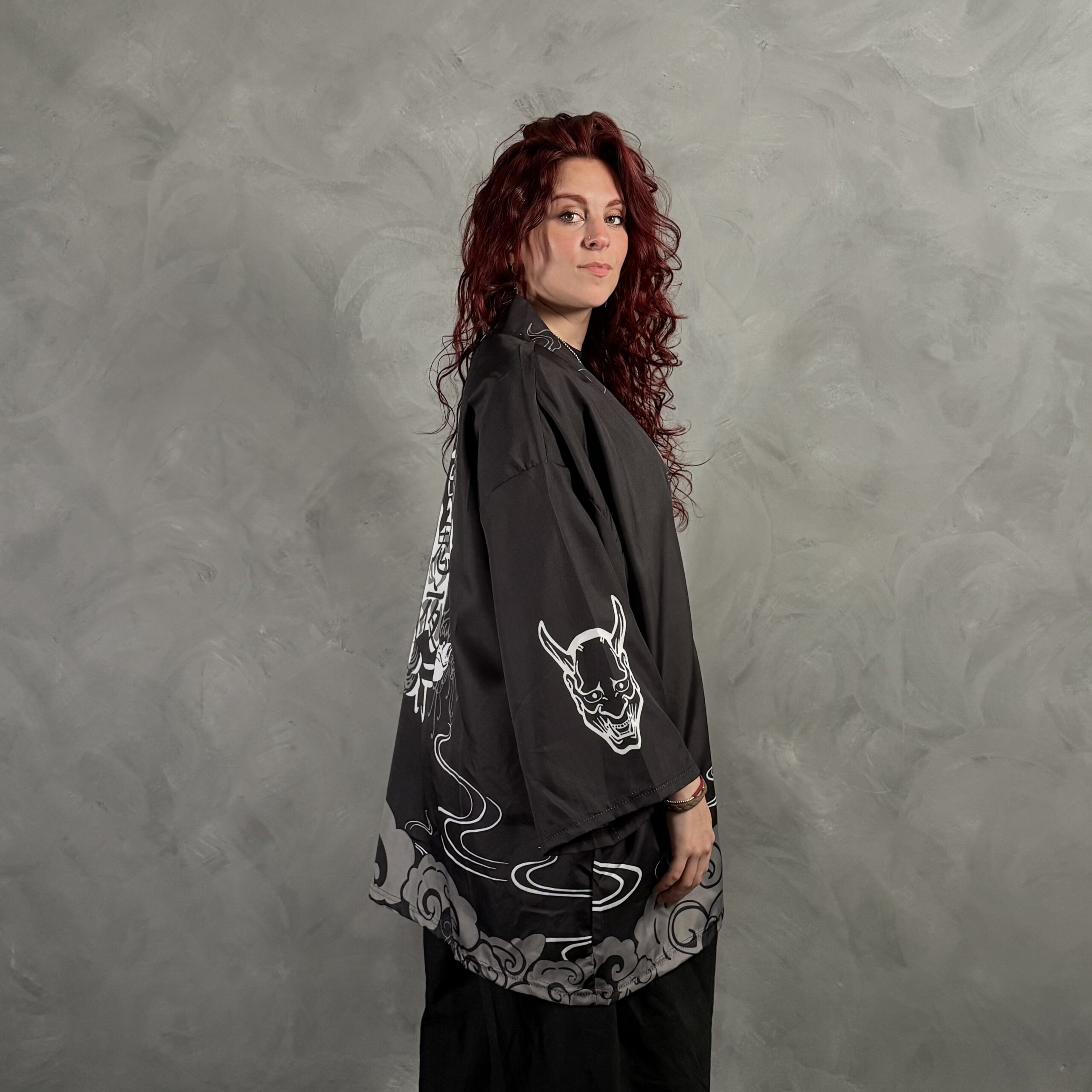 Haori negro con ilustraciones de máscaras yokai y caligrafía japonesa. Inspirado en leyendas tradicionales japonesas.