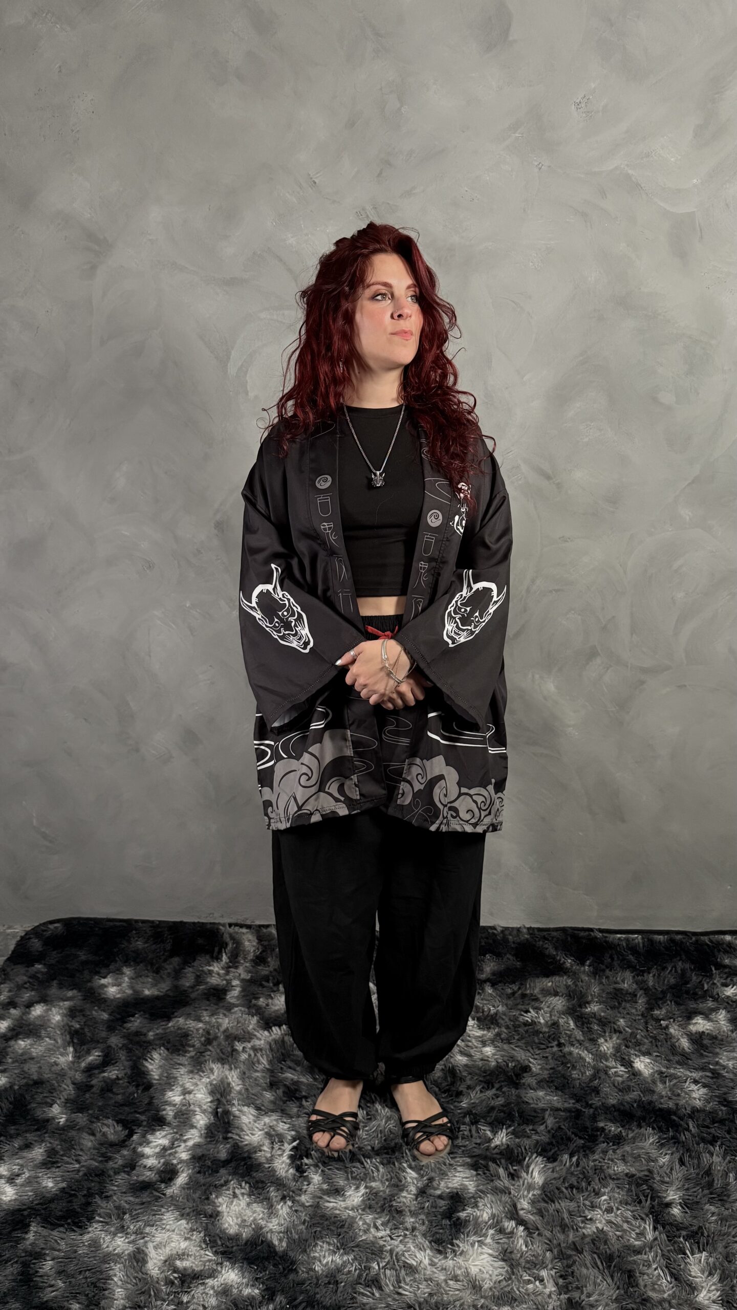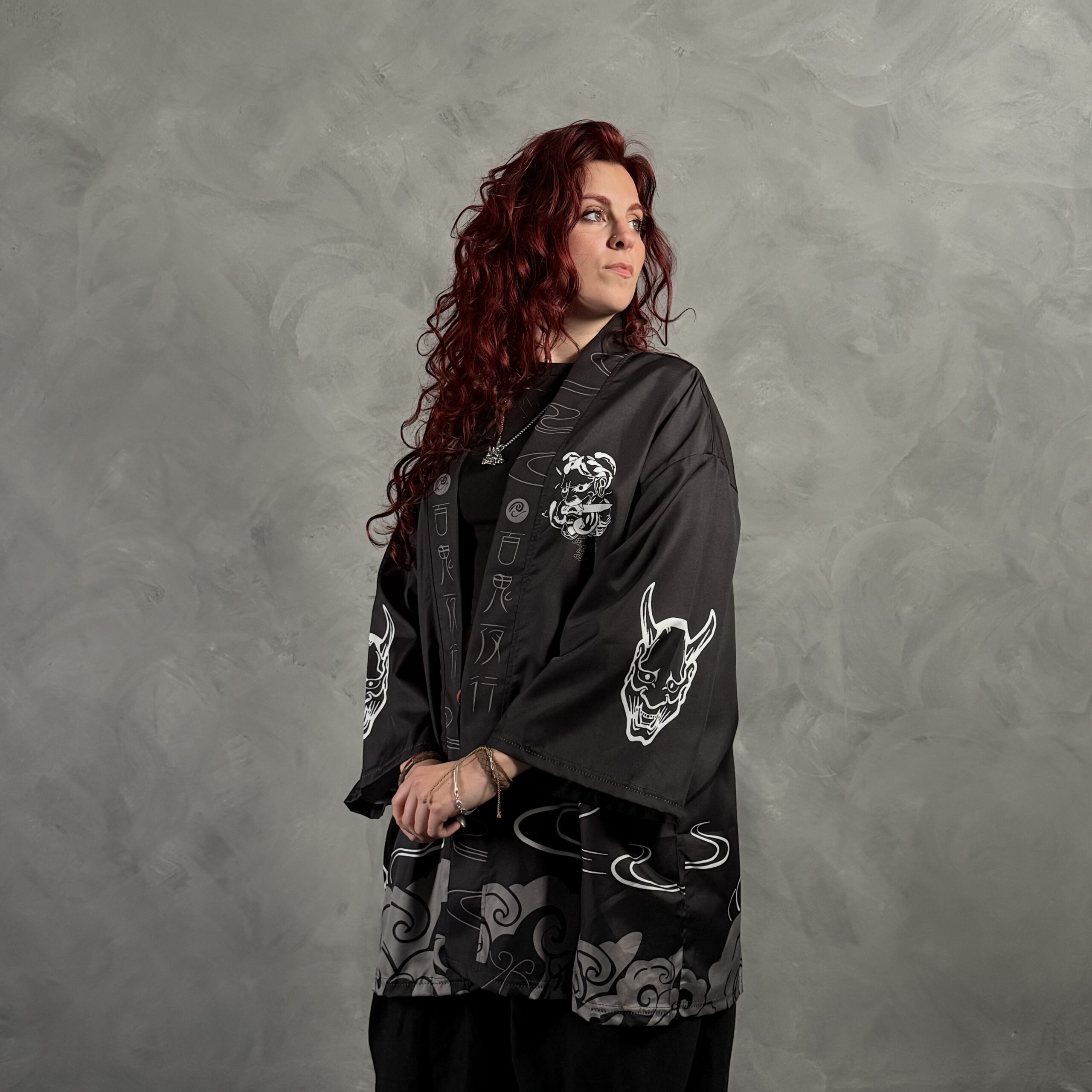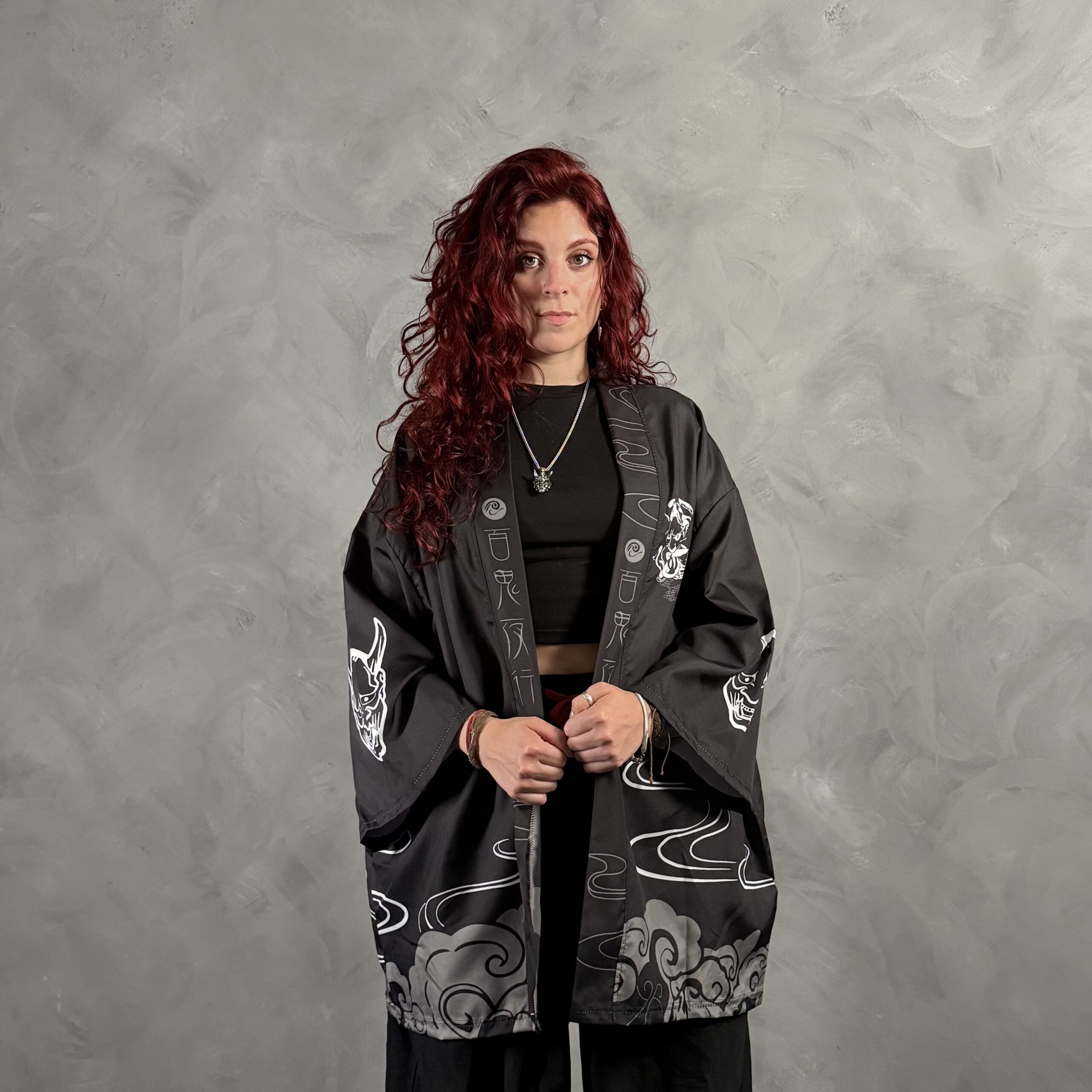Haori negro con ilustraciones de máscaras yokai y caligrafía japonesa. Inspirado en leyendas tradicionales japonesas.