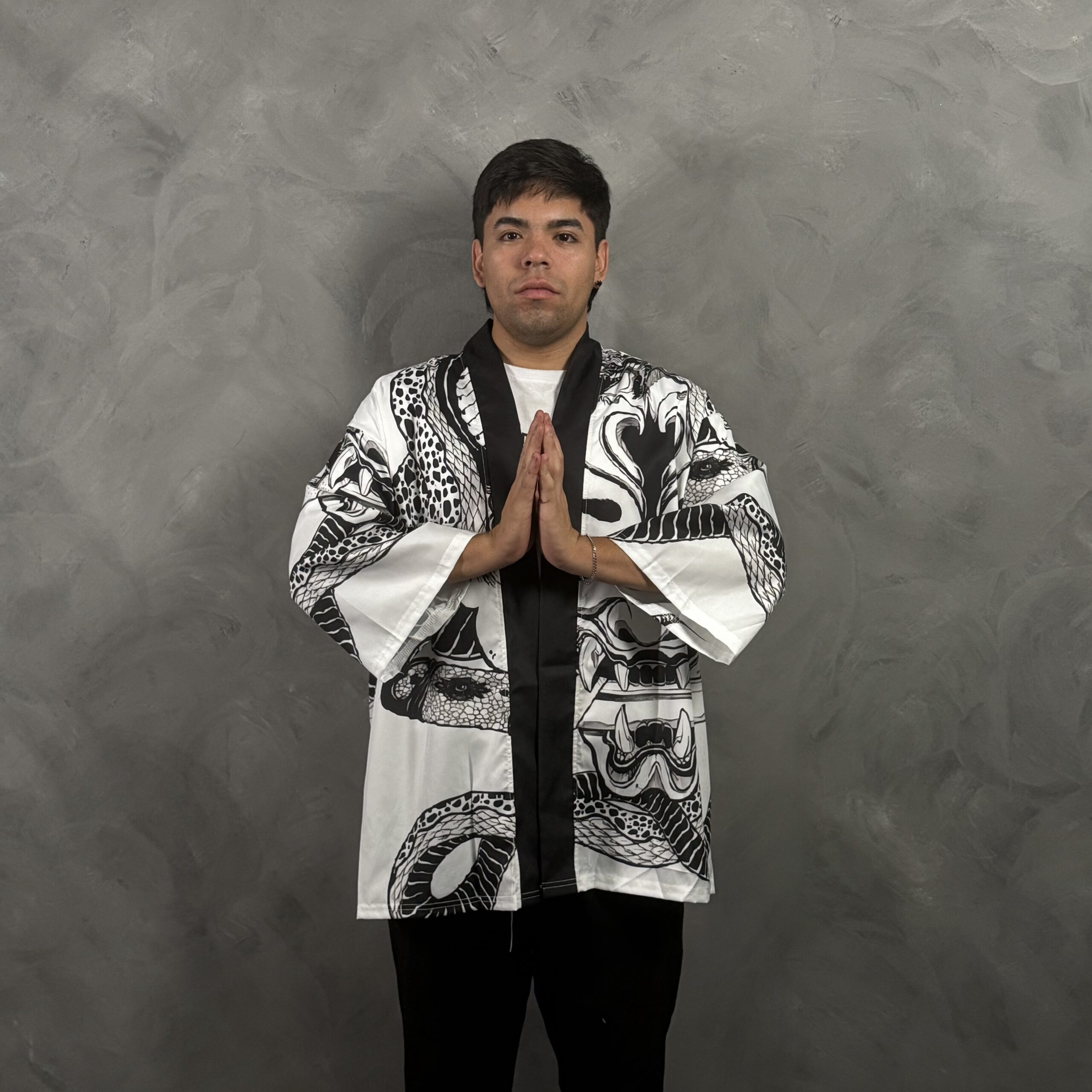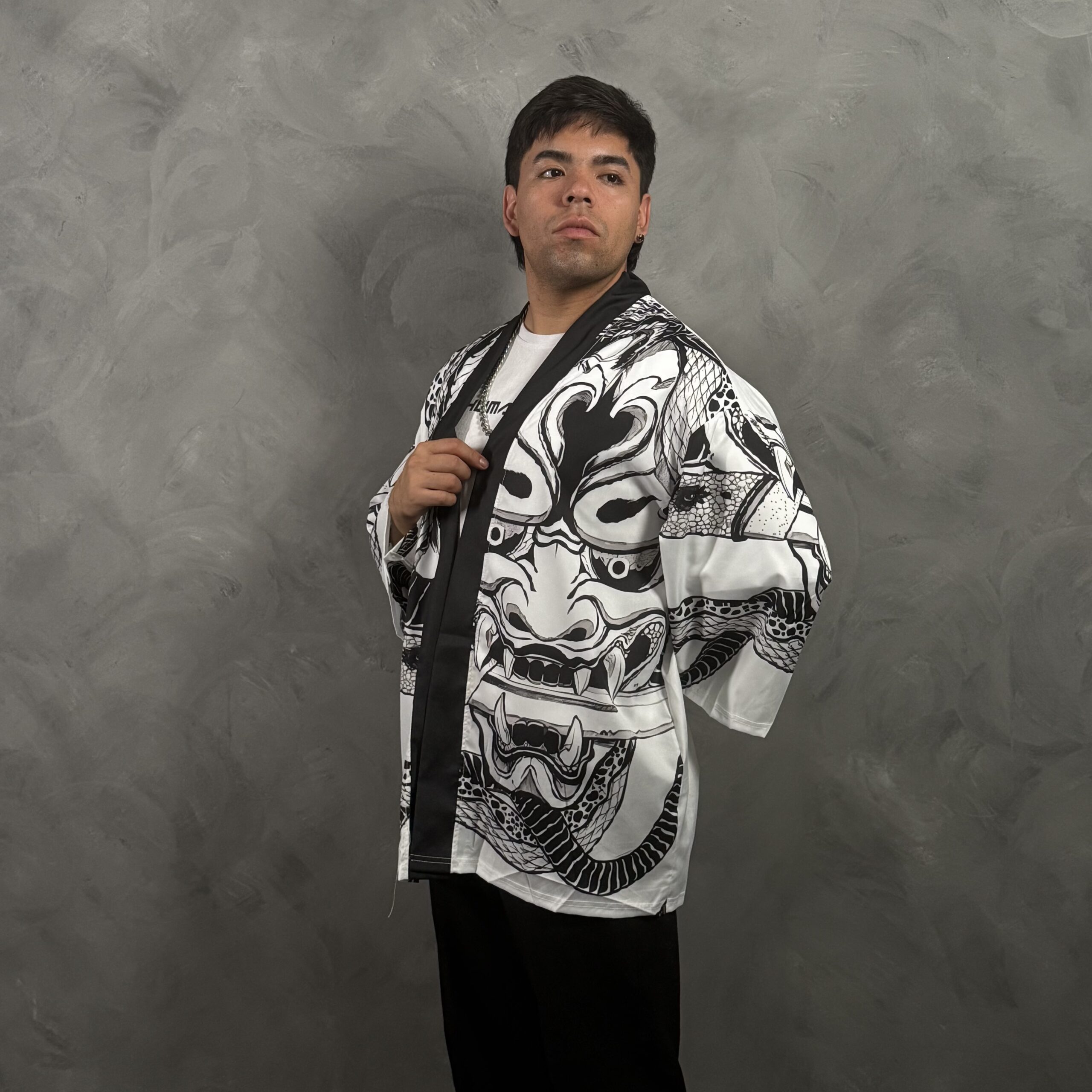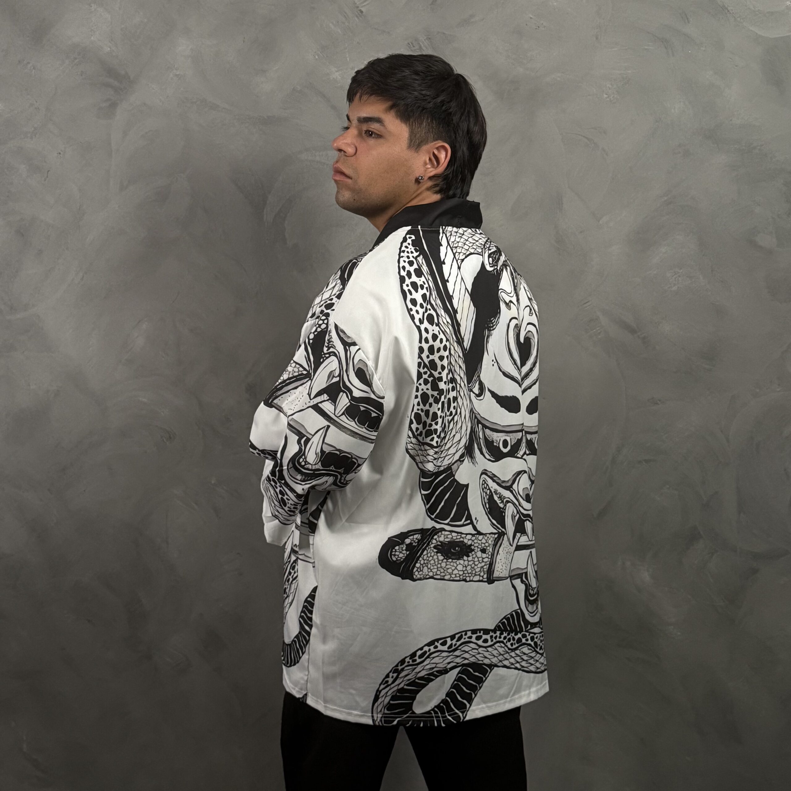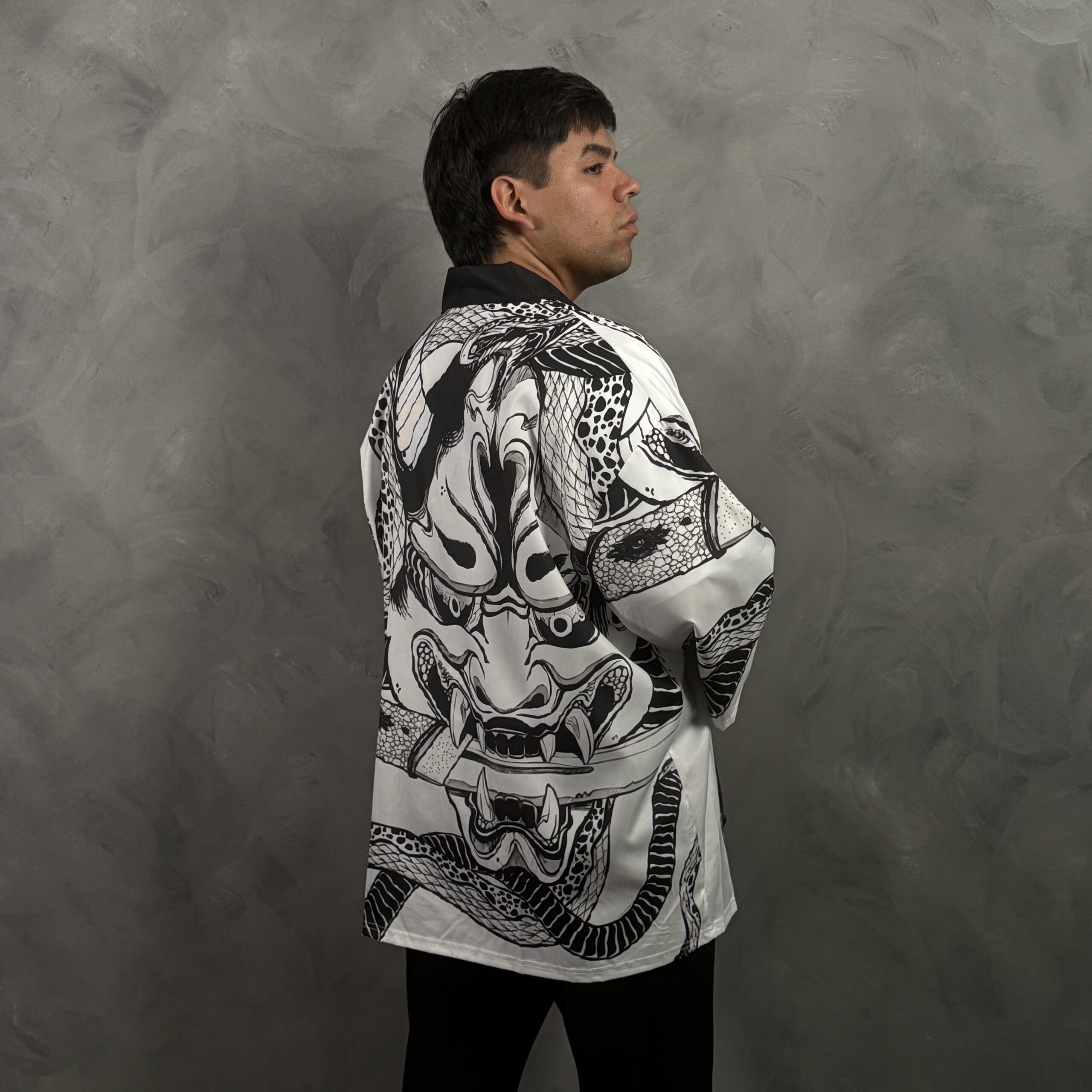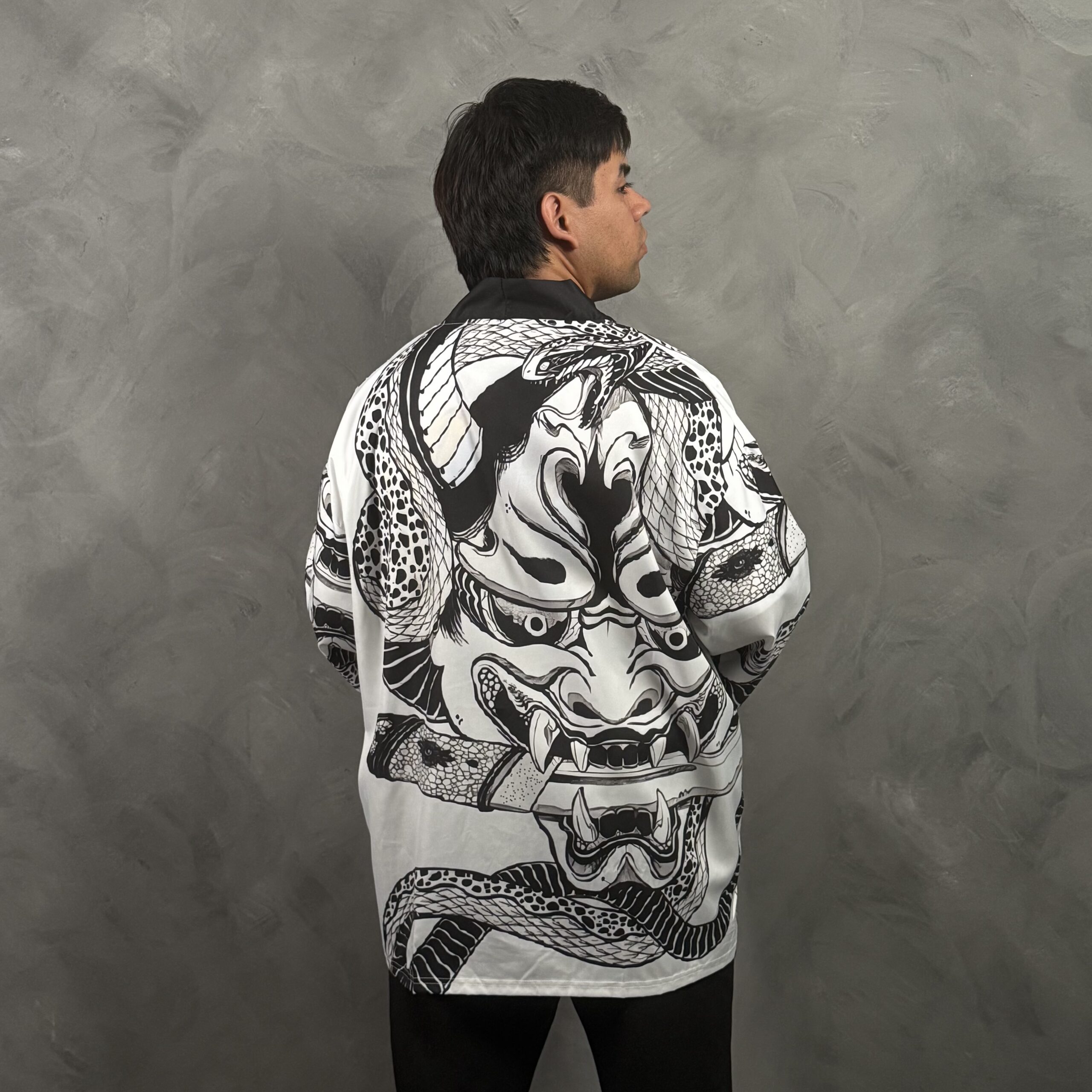 Haori oversize unisex en blanco con estampa full print de máscara oni y serpiente entrelazada.