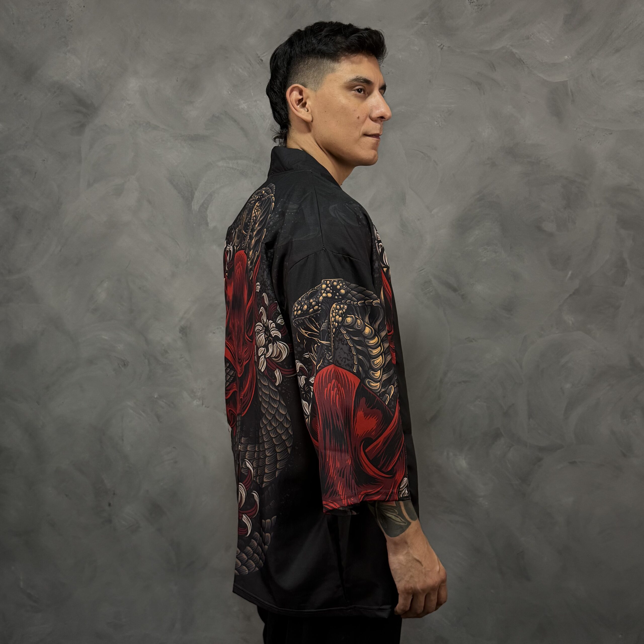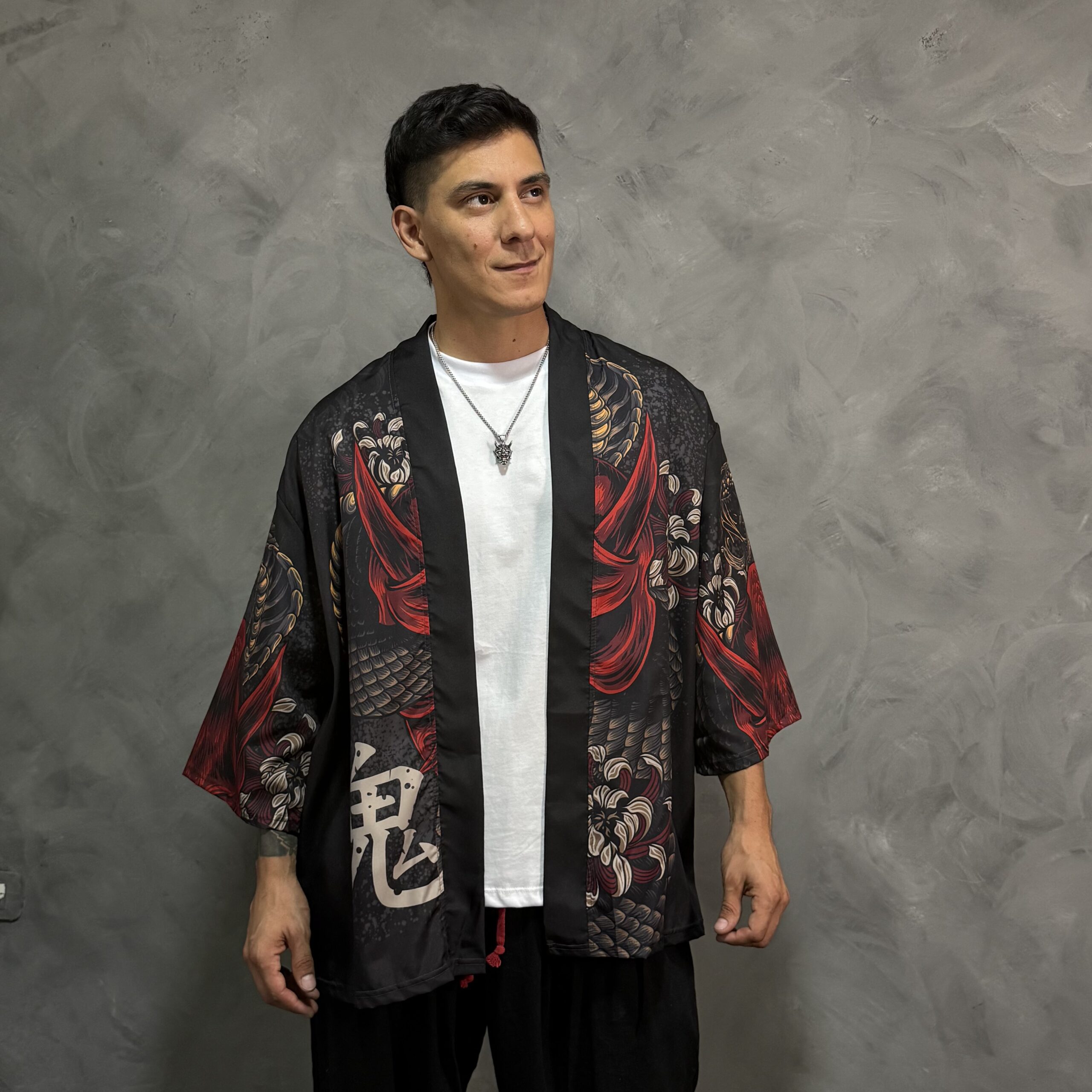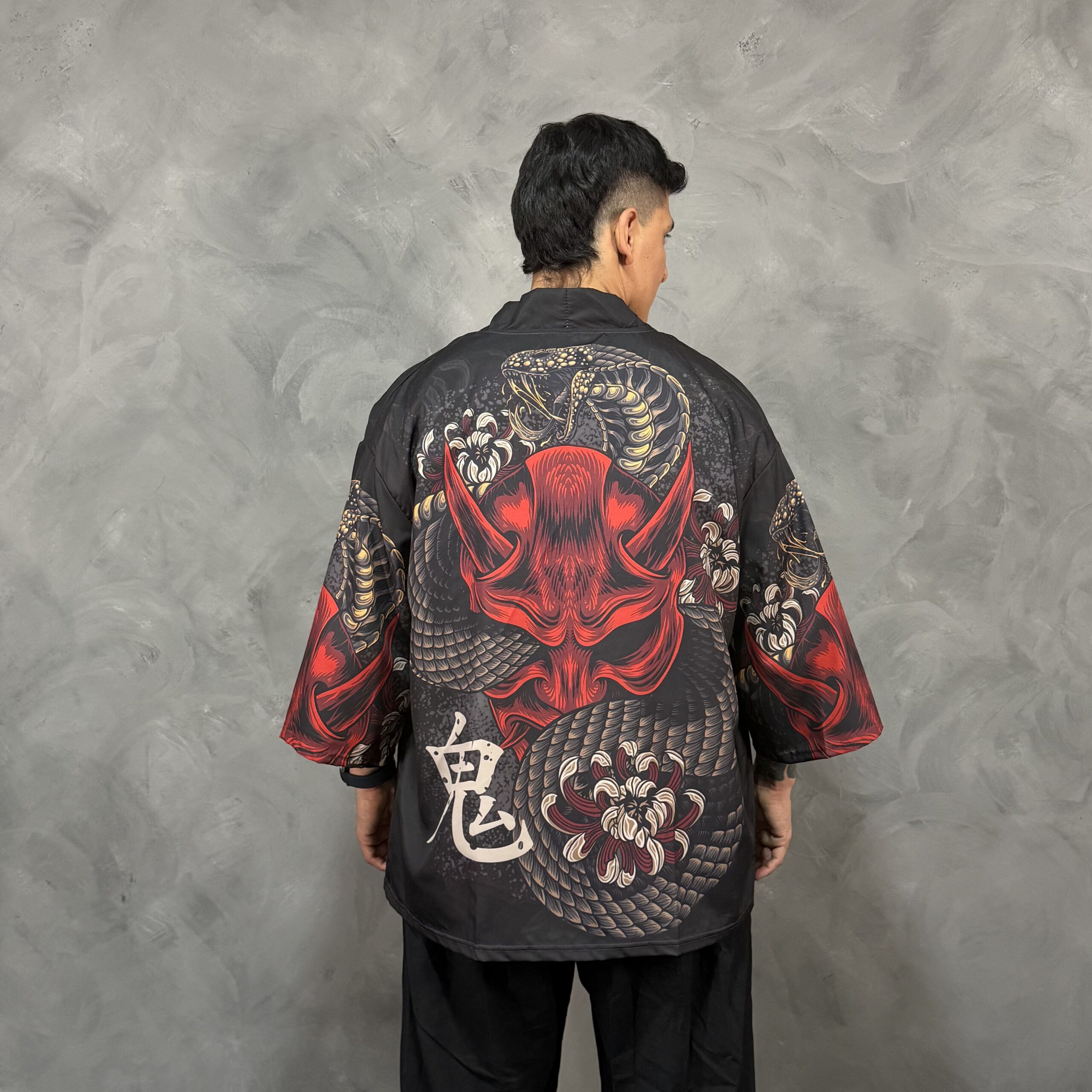 Haori unisex de poliéster con diseño intenso y oscuro: máscara oni roja al dorso con texturas tipo escamas/serpiente y flores en tonos neutros. Ideal para un look fuerte sin complicarse: remera lisa + jean/negro + este haori.