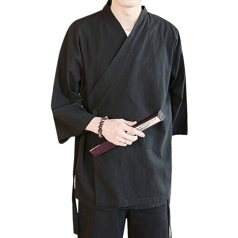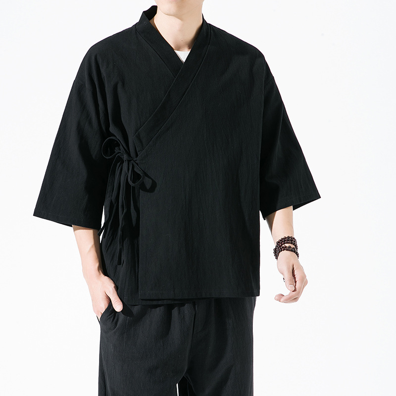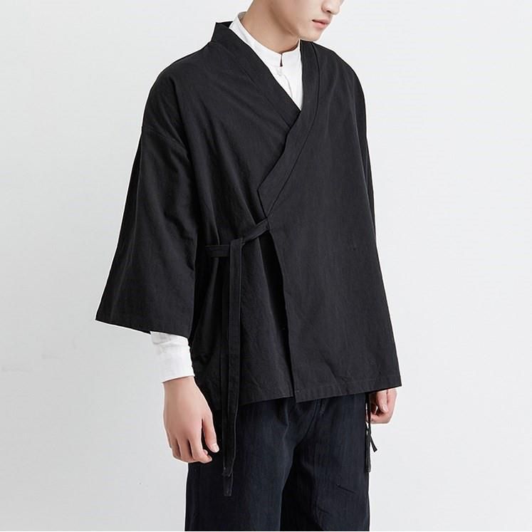 Haori de lino en negro, cruzado al frente con lazo lateral para ajustar a tu forma. Minimalista, cómodo y con caída limpia: queda perfecto para un look urbano sobrio o un outfit más elegante sin esfuerzo. Se puede usar cerrado tipo wrap o abierto como capa liviana.