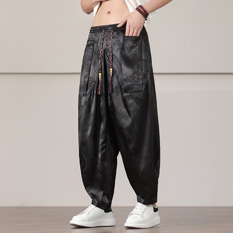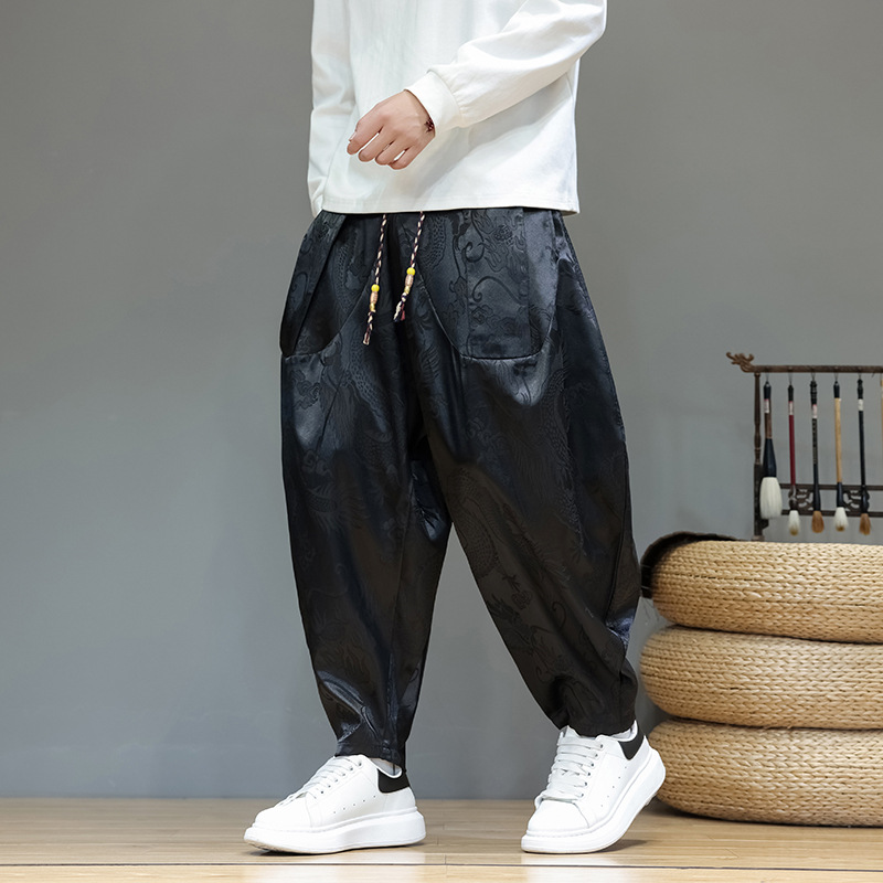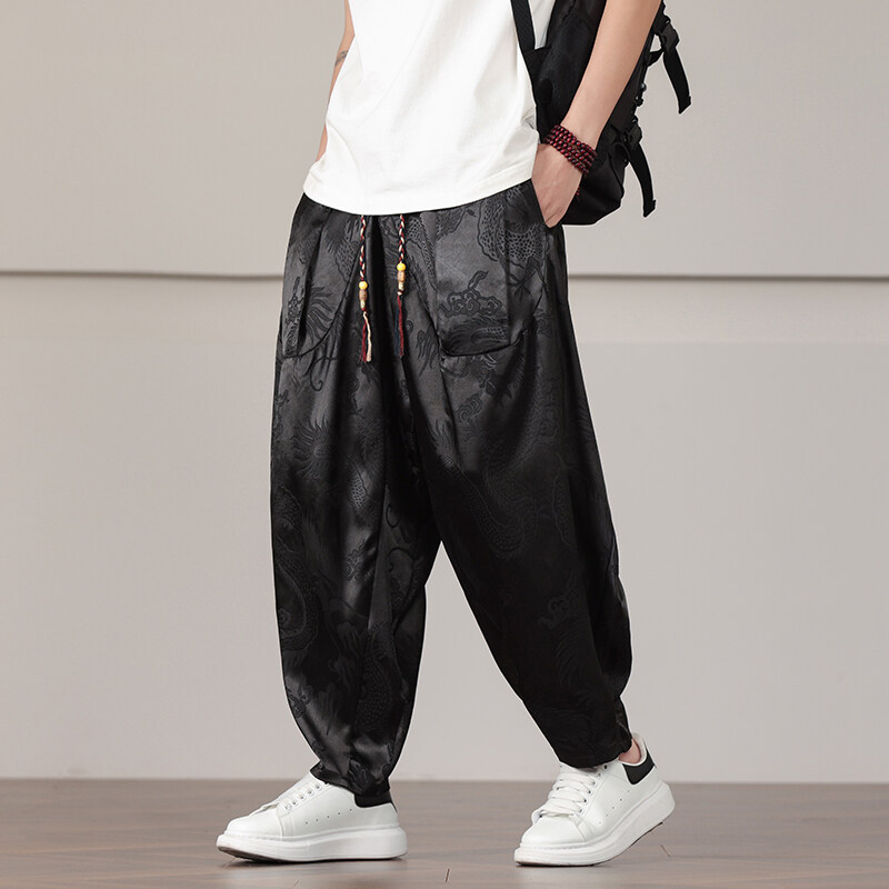 Pantalón estilo japonés tipo sarouel / baggy, con calce amplio y caída suave. La tela tiene un diseño oriental en relieve (tipo jacquard) con motivos de dragón que se ven sutiles y le dan un look premium sin ser exagerado. Cintura elástica con cordón regulable y puños en el tobillo para que asiente bien y no “arrastre”. Ideal para streetwear, outfits urbanos y para usar cómodo todo el día.