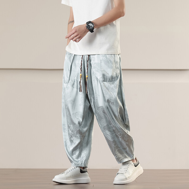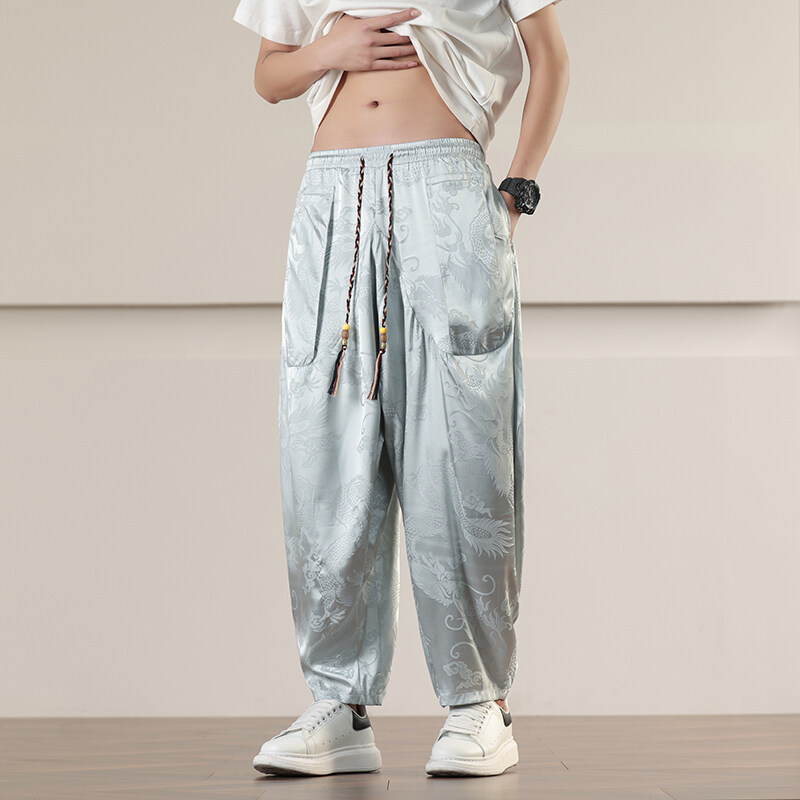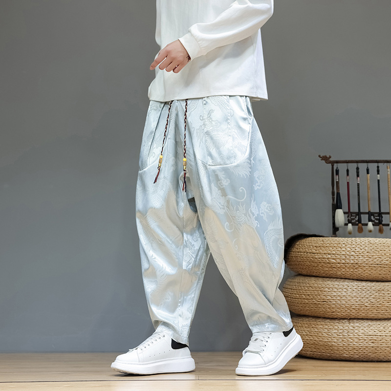 Pantalón estilo japonés tipo sarouel / baggy, con calce amplio y caída suave. La tela tiene un diseño oriental en relieve (tipo jacquard) con motivos de dragón que se ven sutiles y le dan un look premium sin ser exagerado. Cintura elástica con cordón regulable y puños en el tobillo para que asiente bien y no “arrastre”. Ideal para streetwear, outfits urbanos y para usar cómodo todo el día.