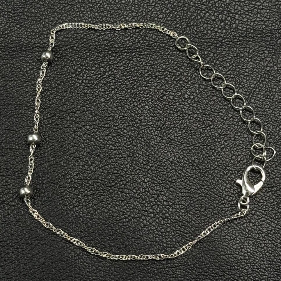 Pulsera plateada con pequeñas esferas distribuidas sobre una fina cadena.